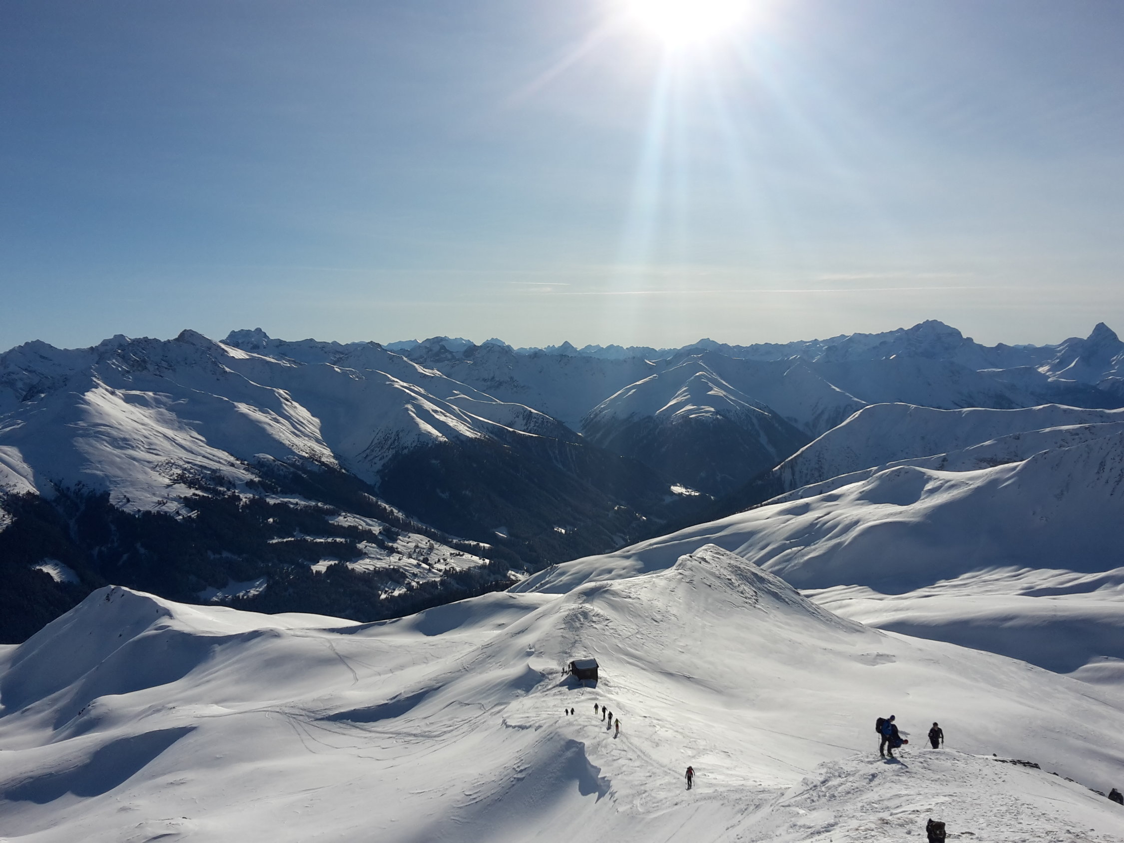 Start um 10:30 an der Bushaltestelle Davos Frauenkirch Landhaus, auf guter Spur und dann auf dem Waldweg hoch zur Stafelalp, dann dem Sommerweg folgend über den Rücken/Grat unschwierig hoch zur Hütte und auf den Gipfel. Überall genug Schnee. Der Gipfelhang ist recht abgeblasen (Vorsicht Wächte), yours truly hat bei der Abfahrt beim Absatz kurz unterhalb des Gipfels (wo man im Sommer mit dem Bike so toll auf die Fr**** fallen kann) ganz kurz getragen. Schöner Pulver bis Stafelalp (nach dem heutigen Grosskampftag natürlich arg zerfahren).