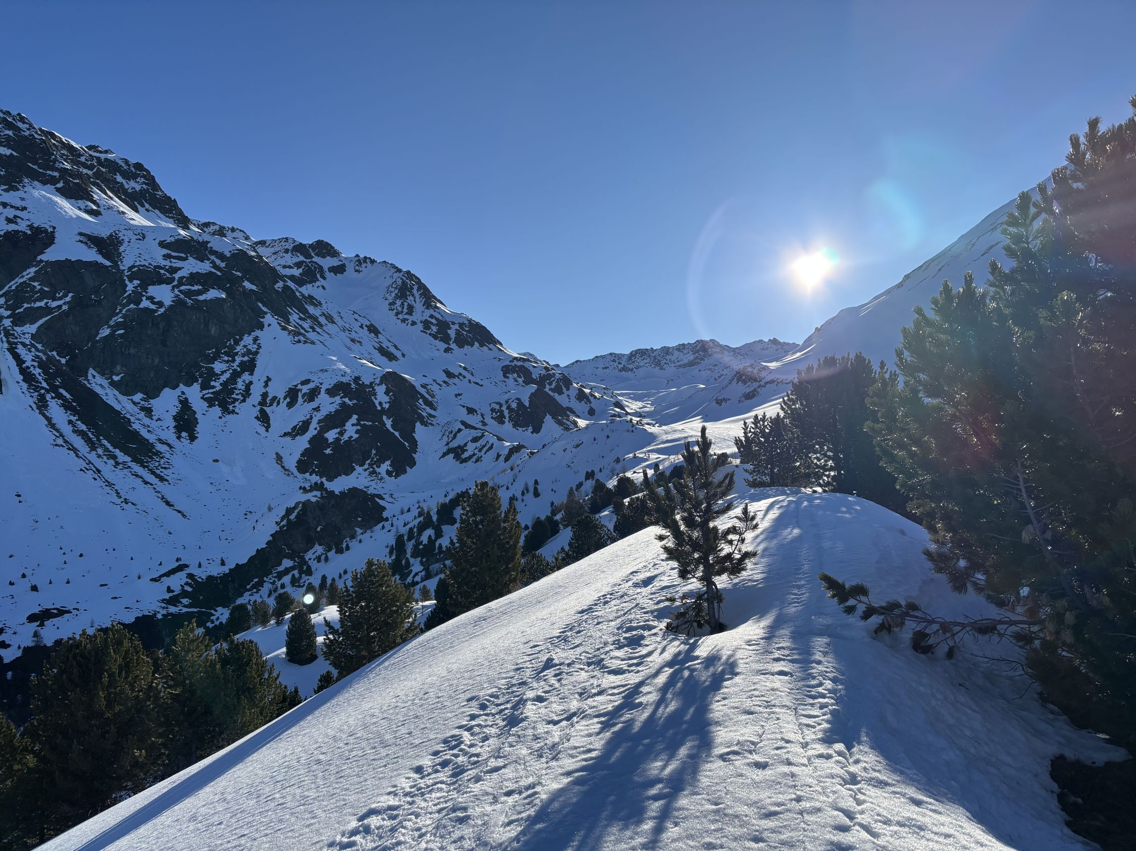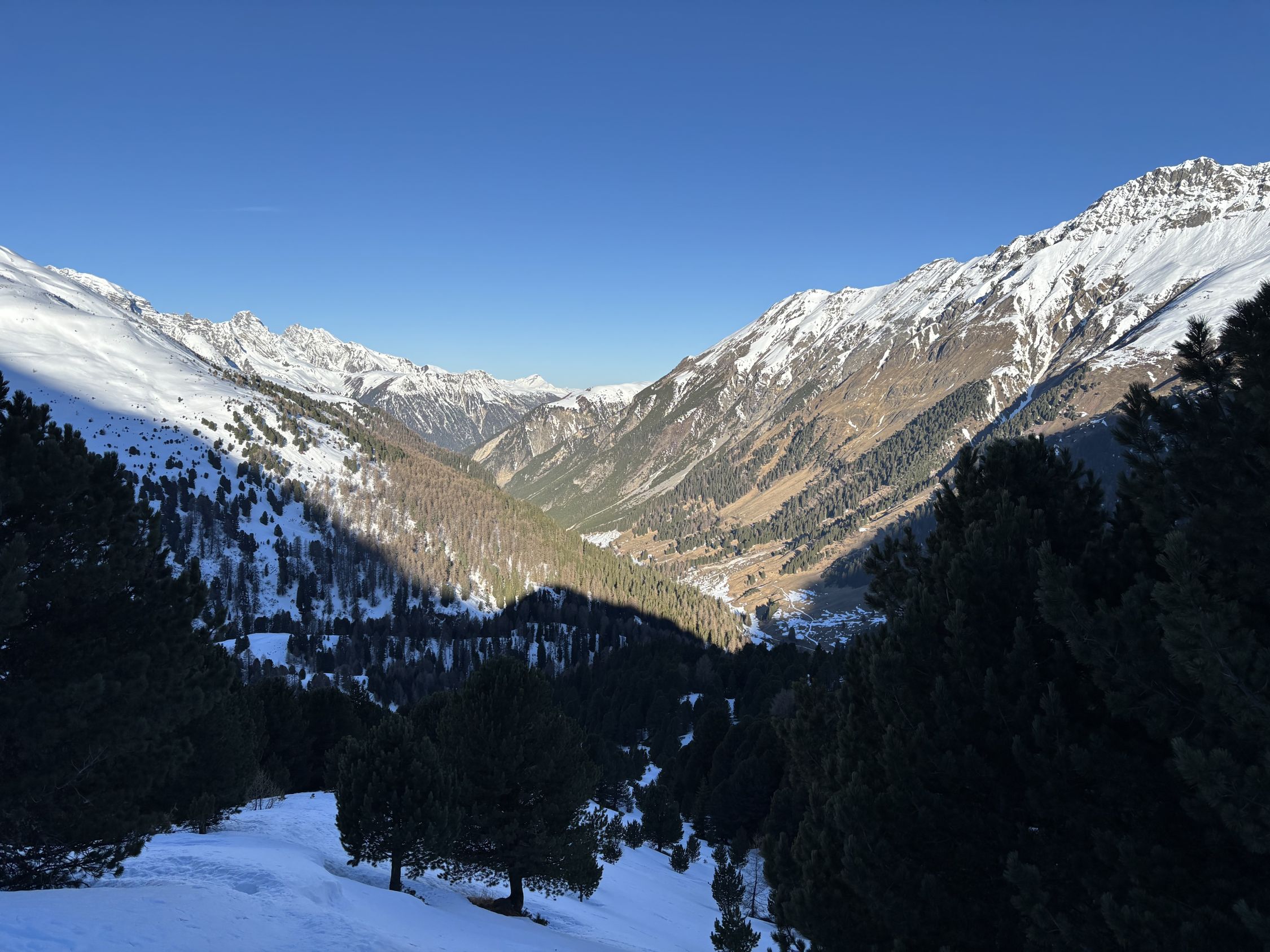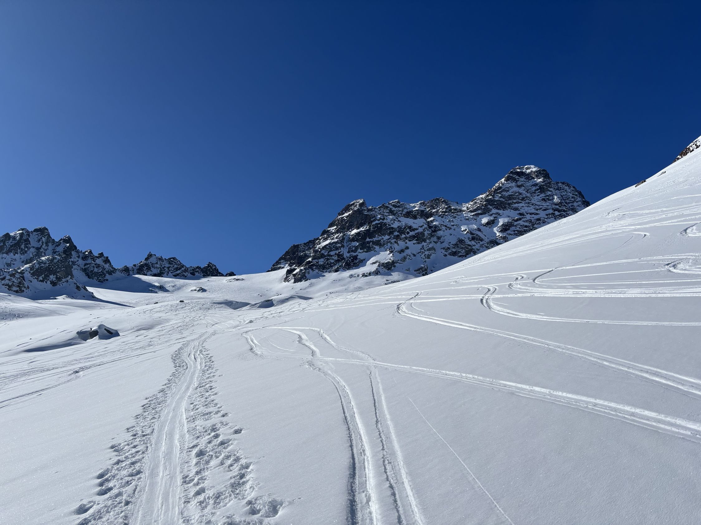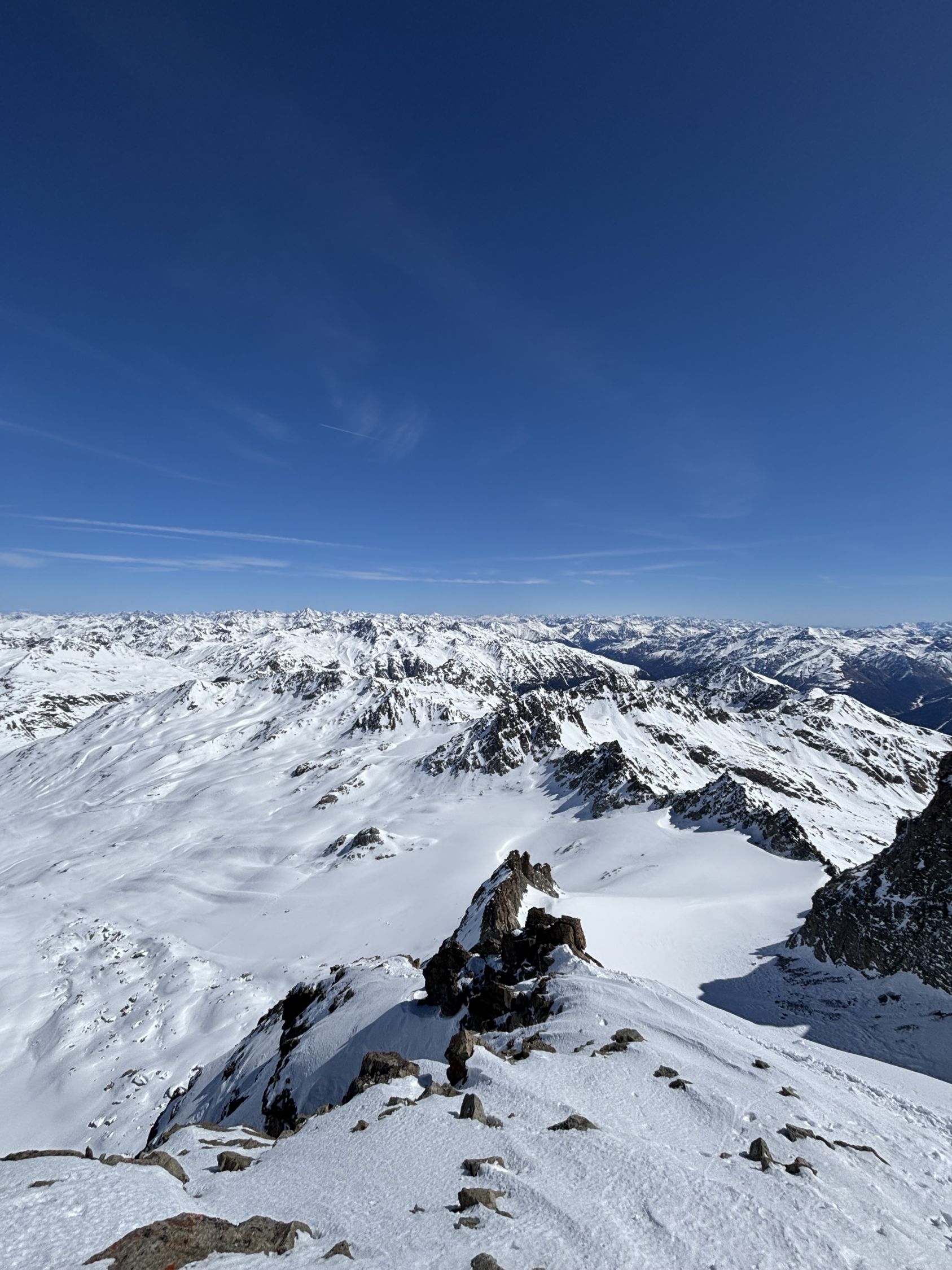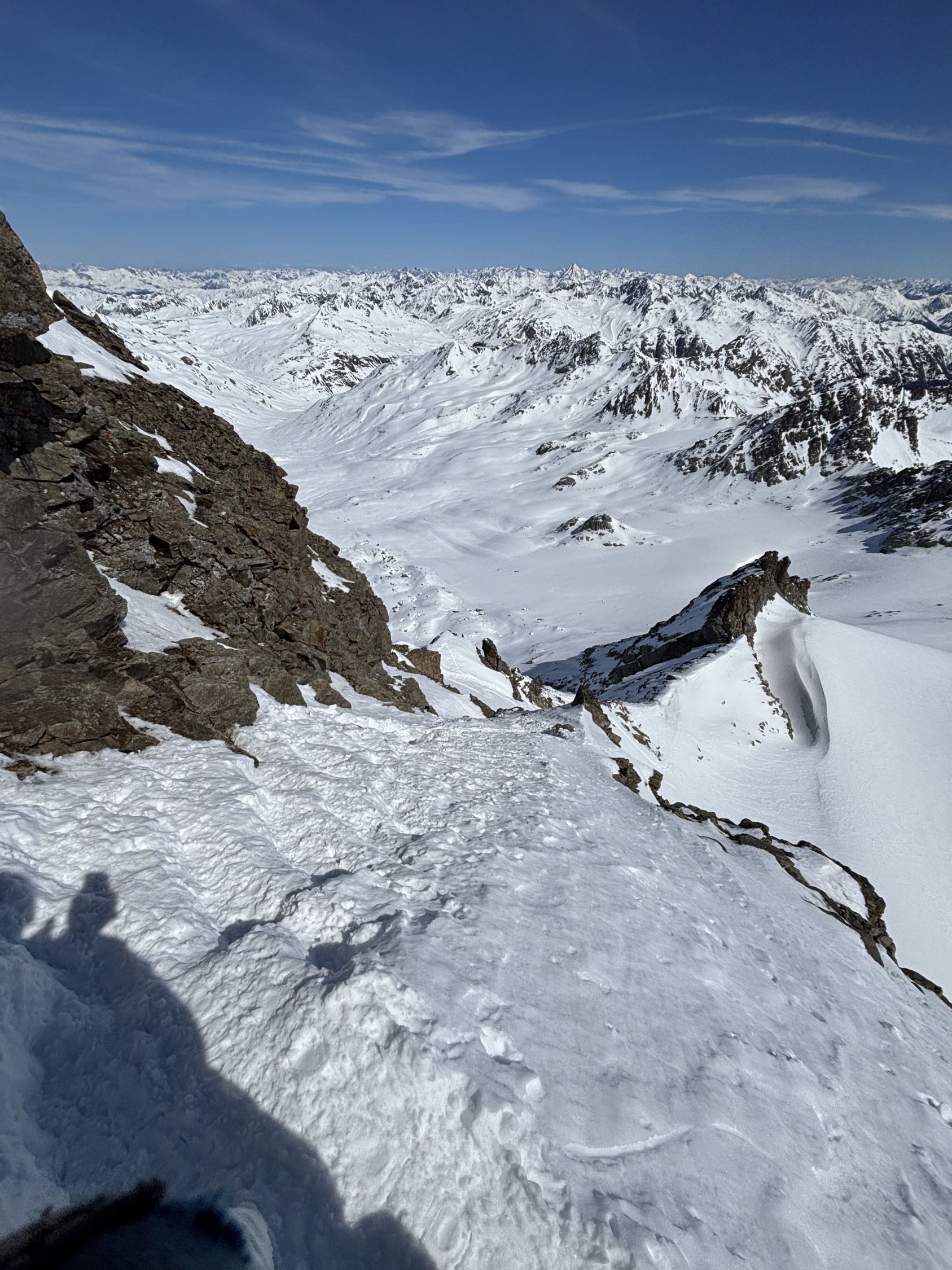 Vom Parkplatz in Latsch bis ca. 1650hm Ski tragen. Von 1830 (Chants) bis P. 2284 (Schegvel) empfiehlt es sich, nordseitig der Krete abzufahren, da südseitig oft kein Schnee liegt. Je früher desto besser, da sehr nass (ich startete um 6 Uhr und war um 14 Uhr zurück, eine Stunde früher wäre sicher nicht schlecht gewesen). Abfahrt über Fora digl Kesch wurde auch gemacht, soweit ich das einsehen konnte. Weiter oben top Verhältnisse, Firn, Sulz. Gletscher sehr gut eingeschneit. Gipfelhang mit sehr gutem Trittschnee. Wird aktuell über Sommerweg begangen (WS, 2c). Alle Bohrhaken frei, falls man mit Seil unterwegs ist. Für sichere Berggänger gibt es genügend feste Griffe im Fels.