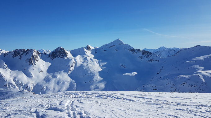 Genügend Schnee ab dem Bahndepot. Oben bearbeitete der Wind den Pulverschnee etwas, weiter unten den einfach Pulver, wenn auch nicht von der Champagner-Qualität. Gipfelaufbau fast pistenartig.