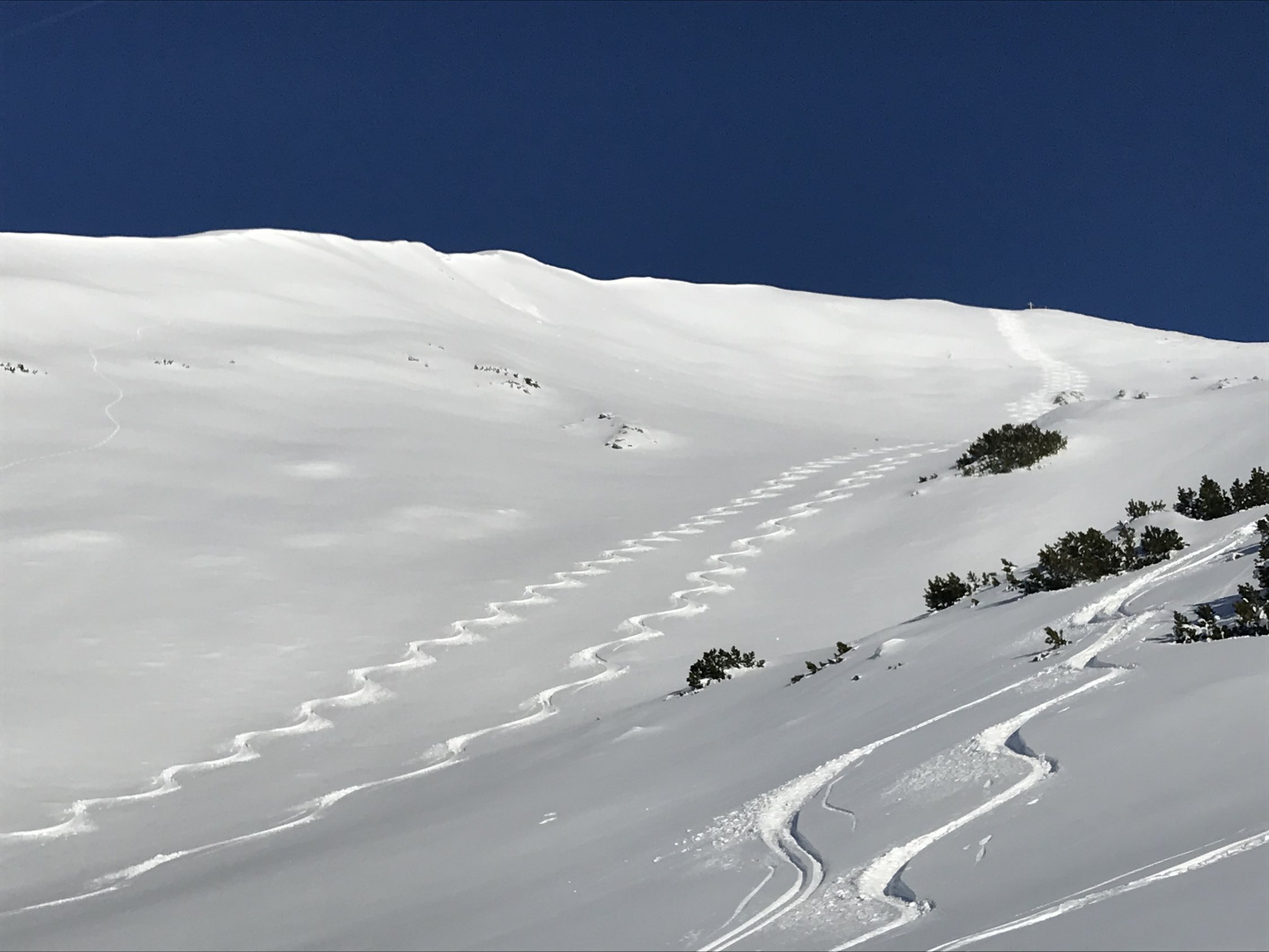 Ein Traumhafter Tourentag mit besten Bedingungen. Der Neuschnee von vorgestern (10-15 cm) ist derzeit noch feiner Pulver und dank der kalten Temperaturen von gestern noch bis weit herunter fluffig. Lediglich in steilen Hängen mit direkter südlicher Exposition hat sich ein kleiner Deckel gebildet. Alle anderen Expositionen und nicht so steile Hänge hatten heute noch feinsten Pulver. In der Höhe haben die Temperaturen heute aber deutlich zugelegt und in den Sonnenhängen hat die Schneeumwandlung eingesetzt. Somit sollten diese vermutlich in den nächsten Tagen einen Deckel bekommen. Schattige Hänge sollten aber weiterhin noch mit Pulver zu genießen sein. In Schattlagen hat sich deutlicher Oberflächenreif gebildet.