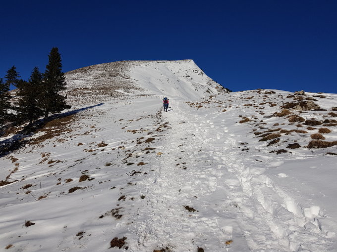 Ich hatte die Schneeschuhe dabei, aber habe sie nicht wirklich gebraucht, so wie auch niemand anders. Die meisten hatten die Schneeschuhe gar nicht dabei. Erst ab 1'500m (ca. Bleiki) gab es eine einigermassen geschlossenen Schneedecke. Ich bin dann via die Westseite (Arhölzli/Müllerboden) abgestiegen, wo es ganz oben ein wenig mehr Schnee hatte.