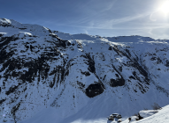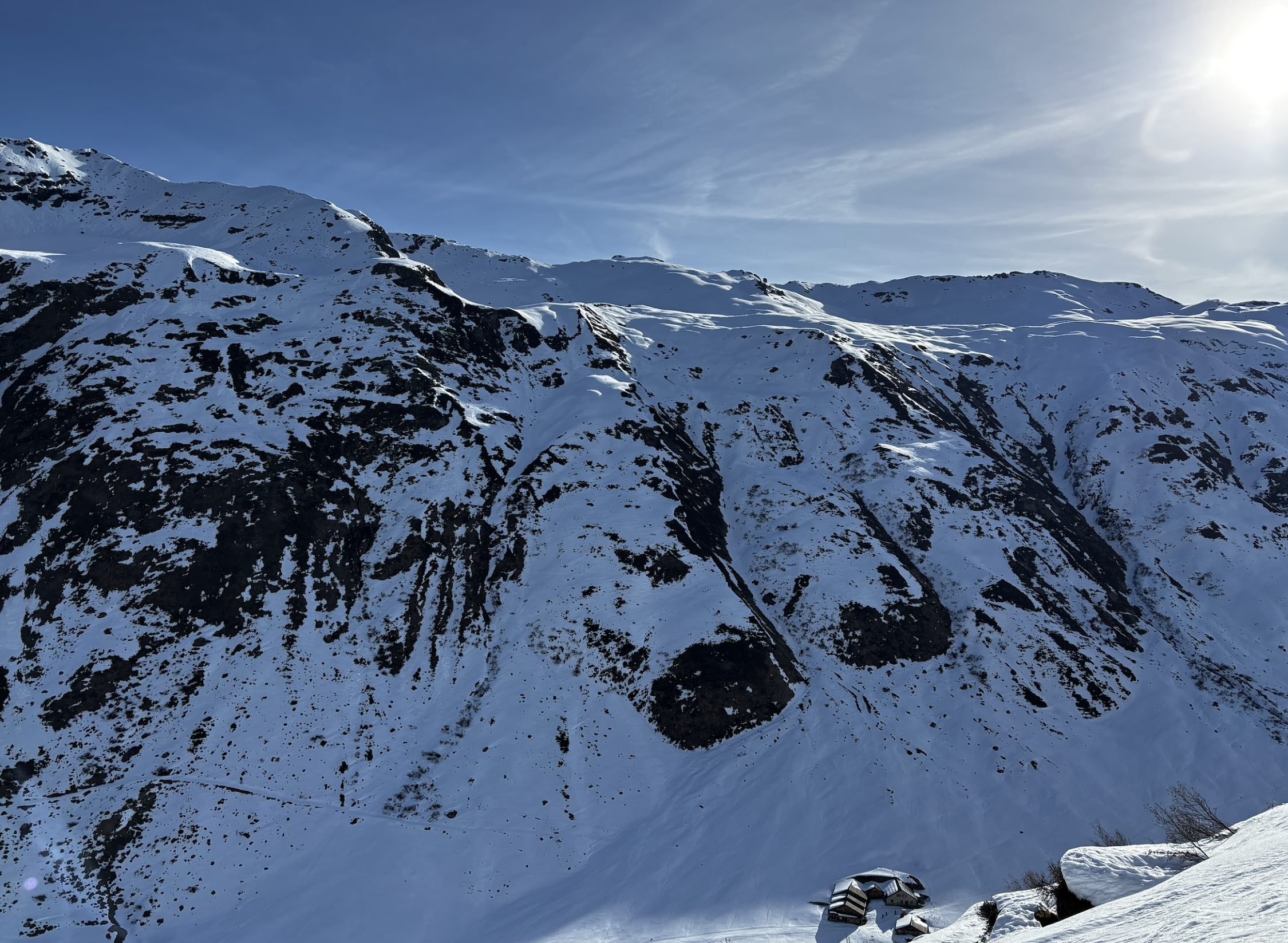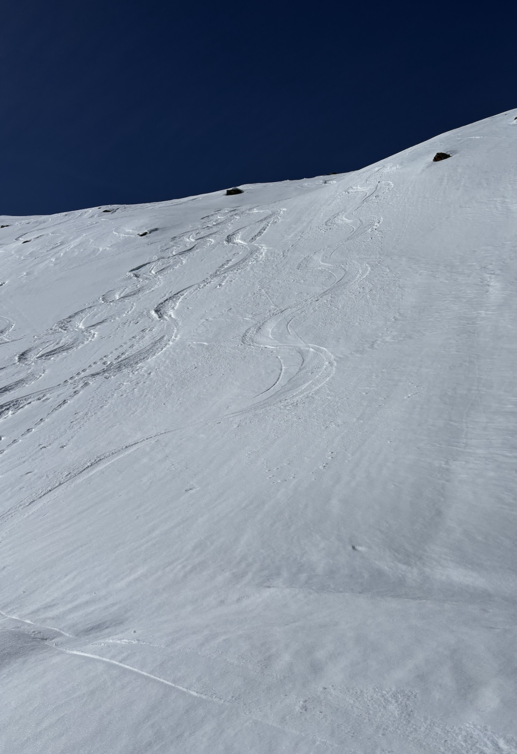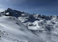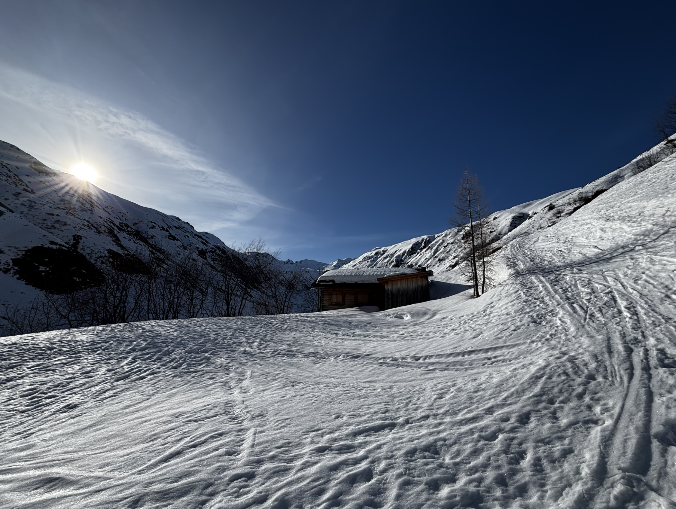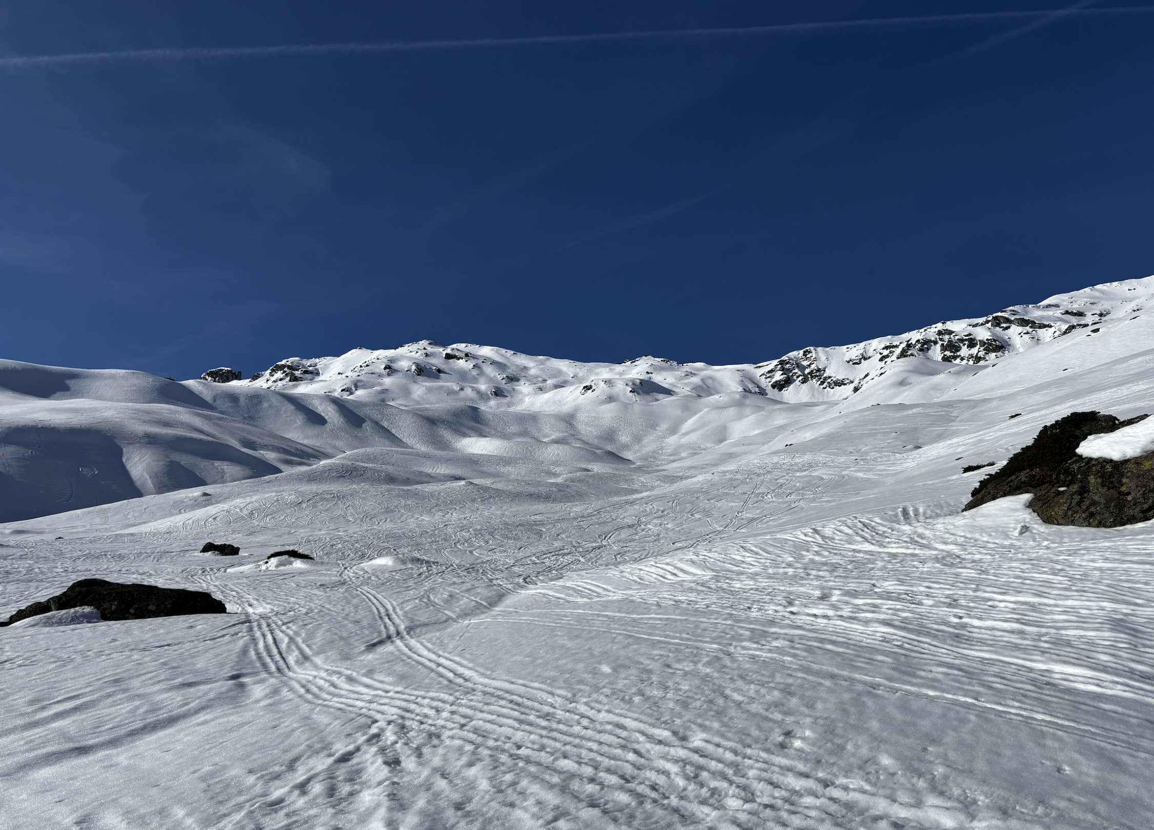 Durch den frühen Start am Morgen und die fehlende Sonneneinstrahlung in den Morgenstunden gab es vor der Vergaldaalpe die Entscheidung statt der Heimspitze den Schneeberg anzusteuern. Ab der Jagdhütte erfolgte der Aufstieg in der Sonne und bei guten tragenden Schneeverhältnissen bis zum Gipfel. Obwohl ein feiner Wolkenfilm die Sonne doch etwas abschirmte, waren bei der Abfahrt um 10 Uhr die der Sonne zugeneigten Hänge top aufgefirnt. Die Hänge in der Steilstufe zur Alpe haben noch einiges an Schneeauflage der letzten Schneefälle und sind aktuell sehr durchweicht und schwierig zu fahren. Besser wäre es über den Hang mit der Aufstiegsspur abzufahren, um dem faulen Schnee auszuweichen.