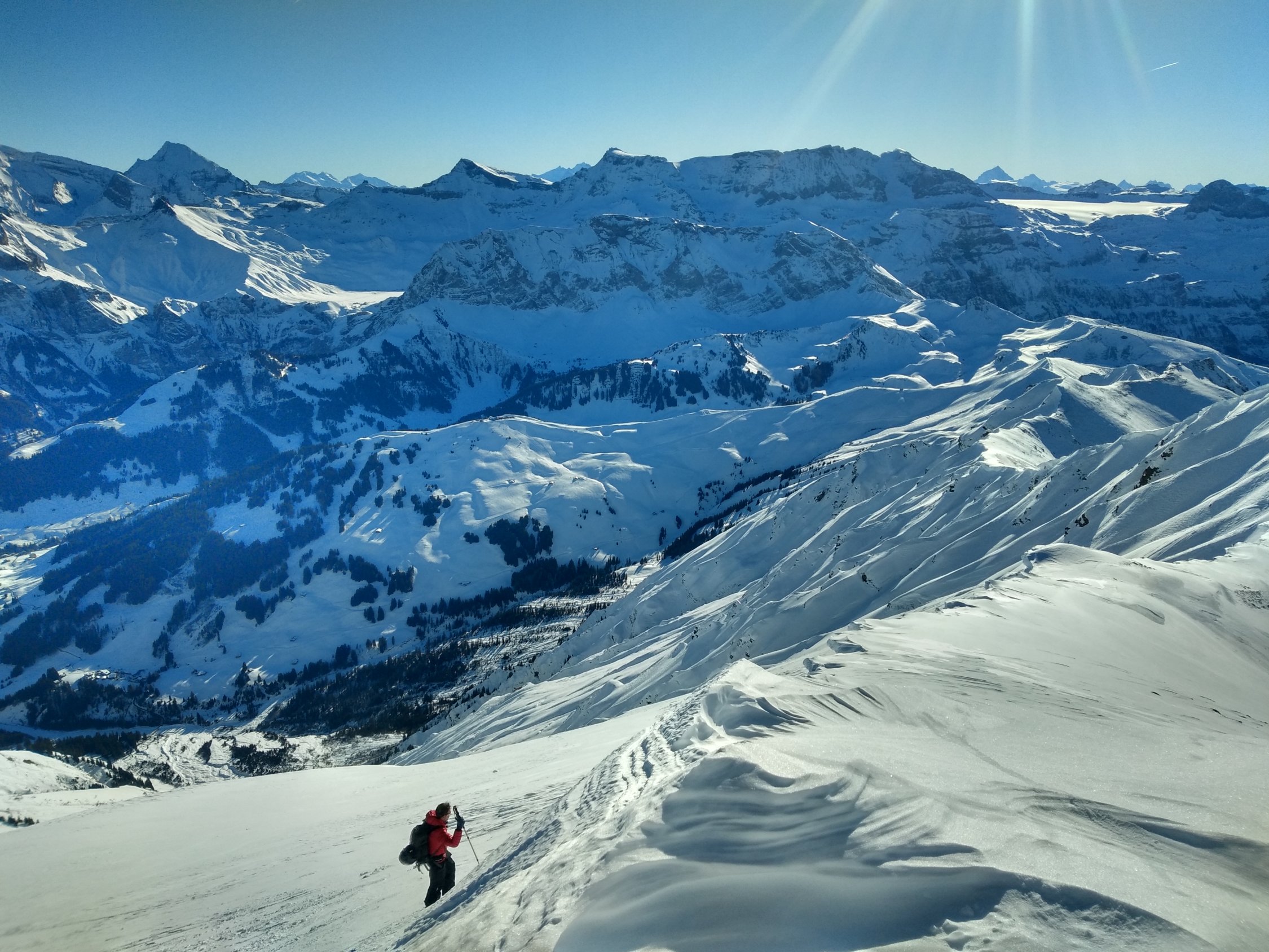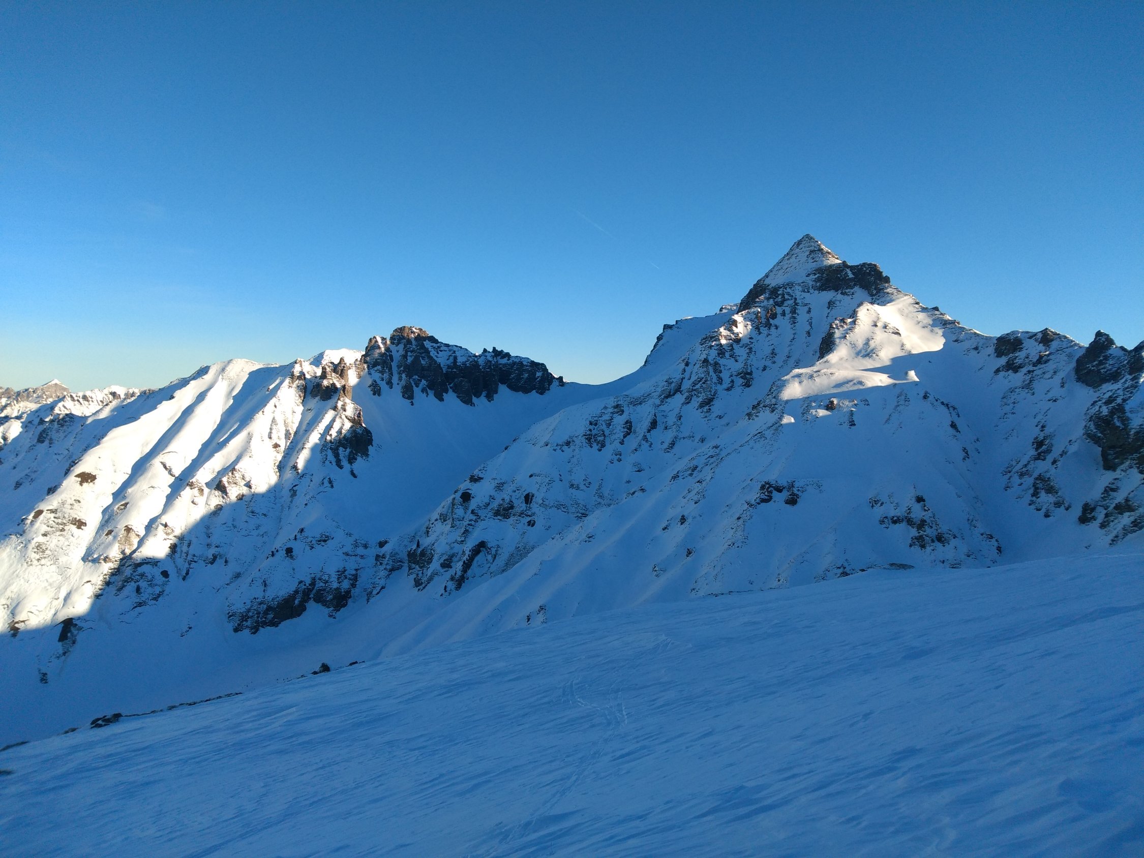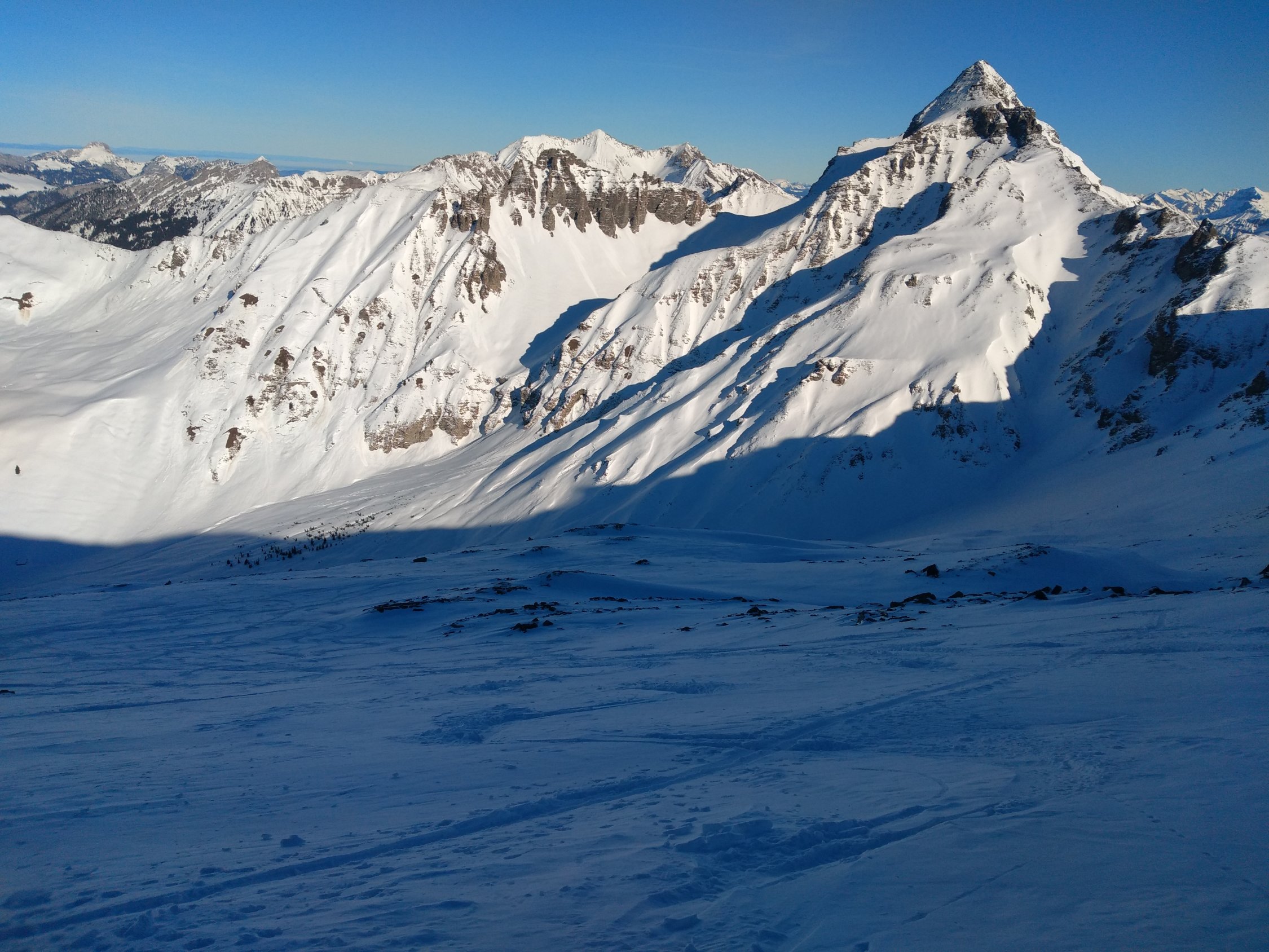Abgefahren sind wir auf der Normalen Aufstiegsrute. Grösstenteils war sehr schön zu fahren, zwischen Pulver und Presspulver. Im mittleren Teil hatte es einen starken Deckel, das war über ca. 300 hm etwas mühsam zu fahren.