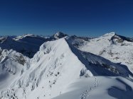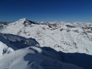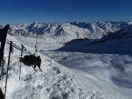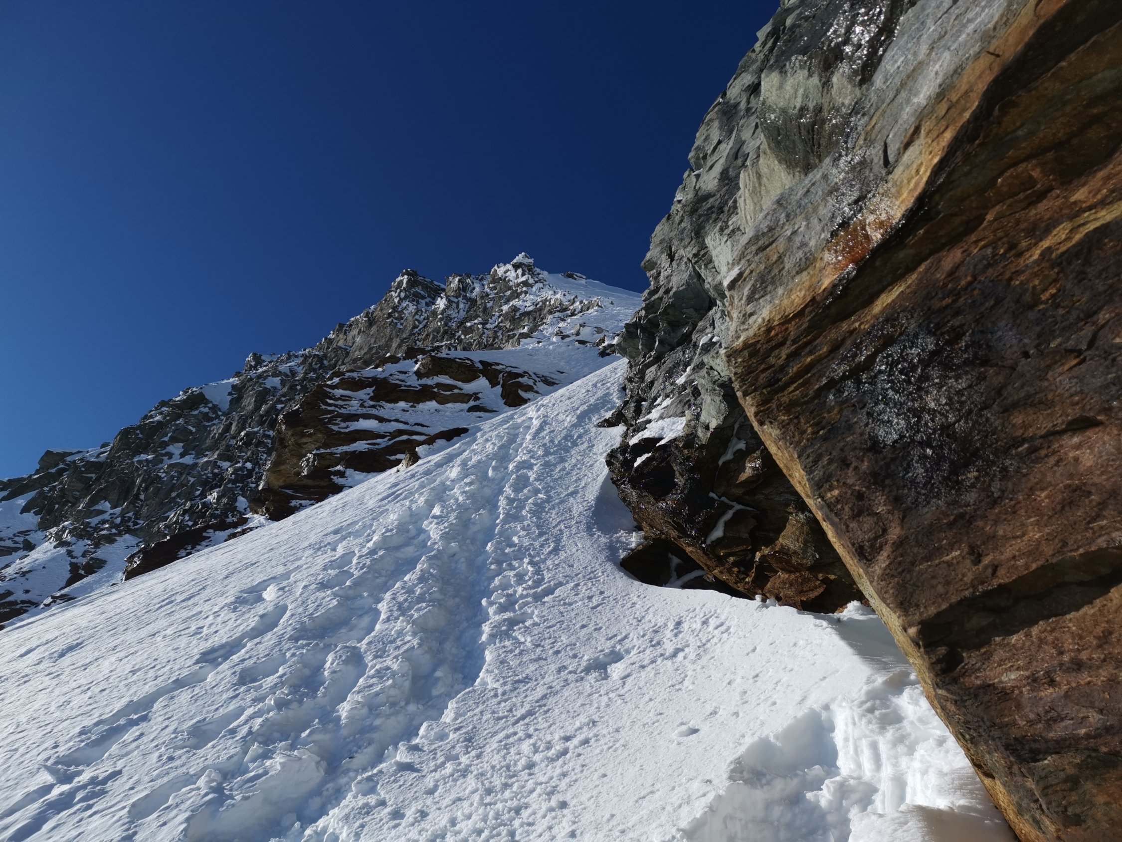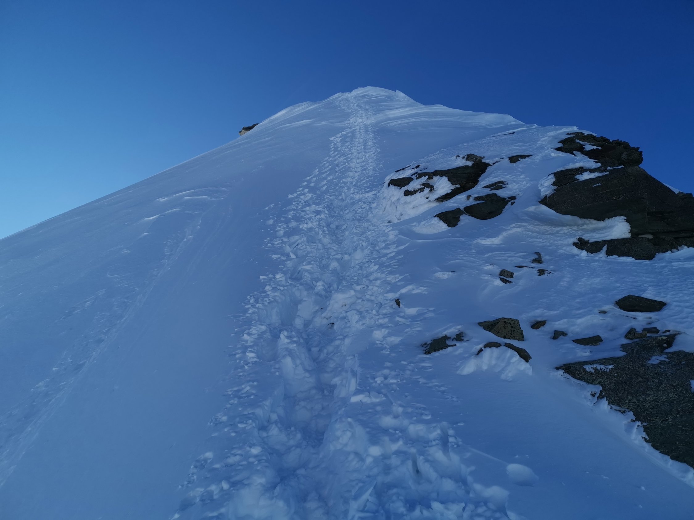 Guter Trittschnee zum Gipfel. Steigeisen und Pickel vorteilhaft.