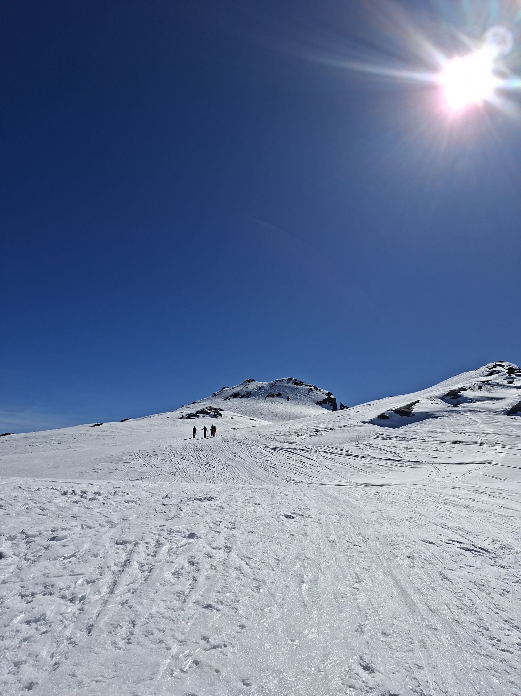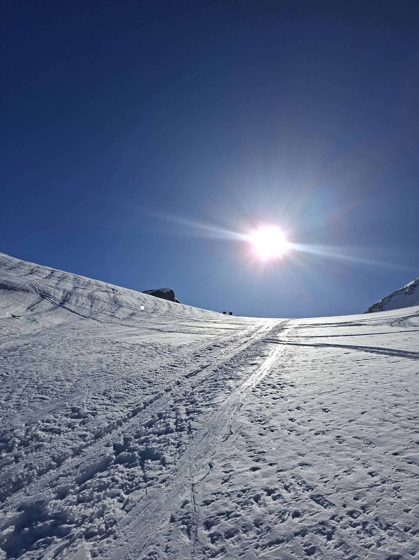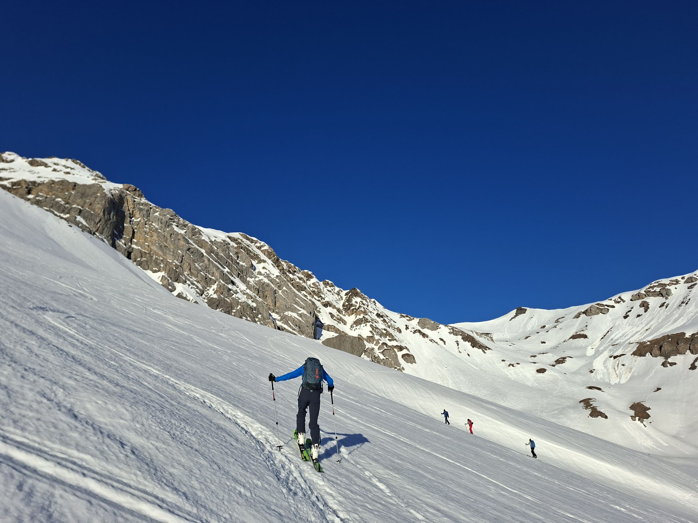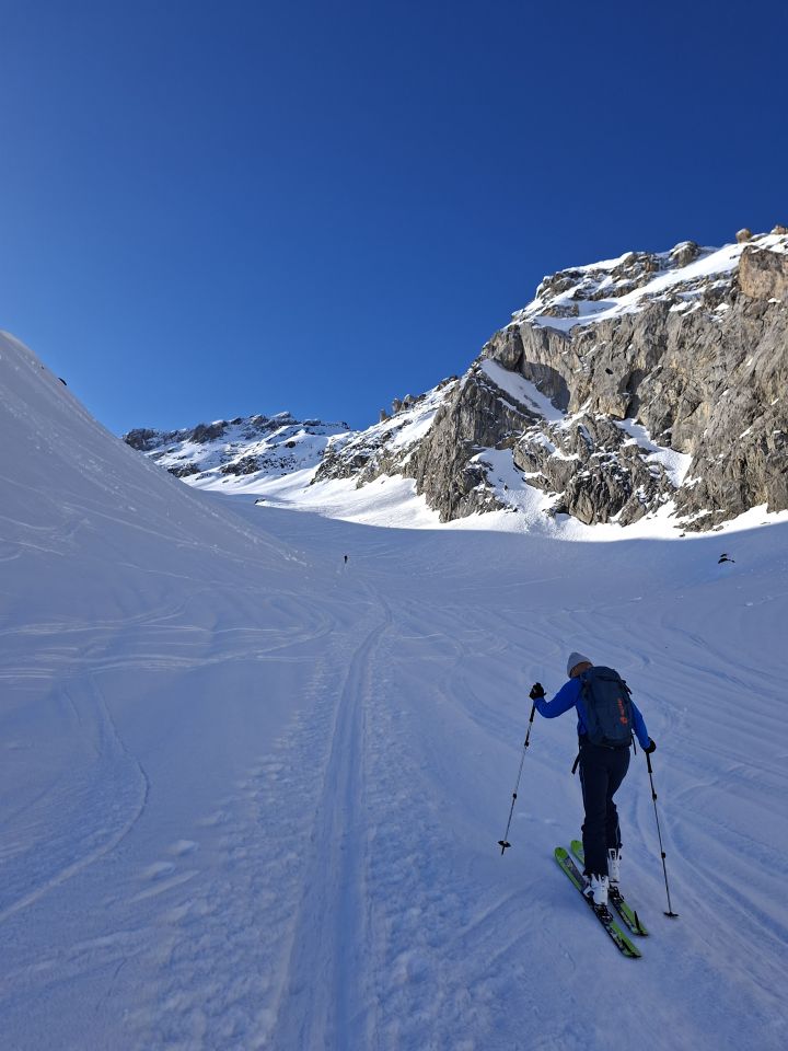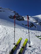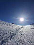 Aufstieg: Die Spur ist gut angelegt und angenehm zu gehen. Ab und zu geht es besser neben der Spur, weil sie zum Teil sehr hart ist. Harscheisen können hilfreich sein, wir haben aber keine gebraucht. Den Aufstieg zum Früestücksplatz geht man zu Fuss, es hat eine gute Spur.