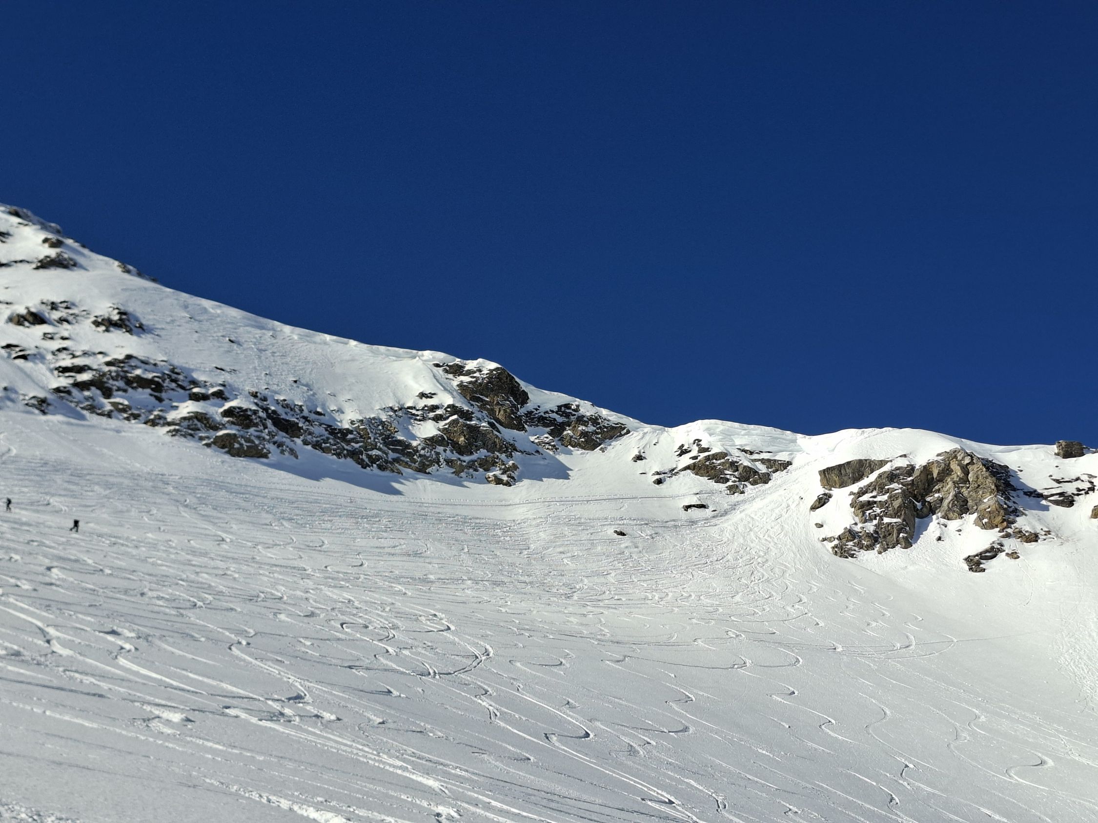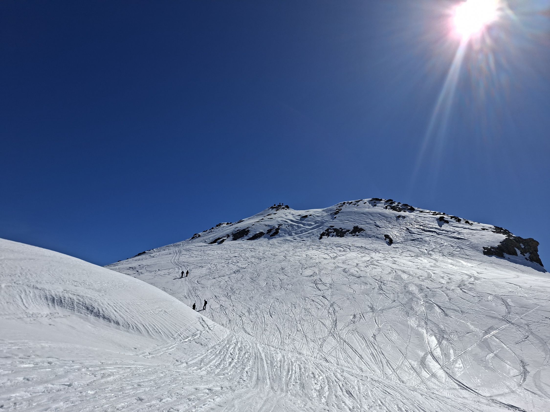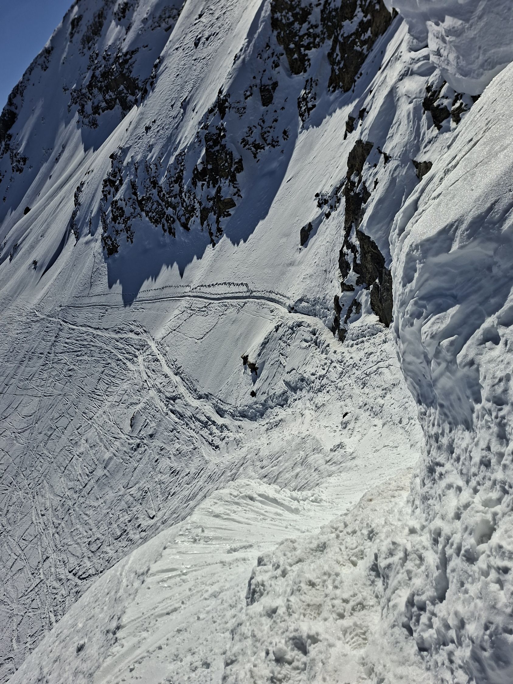 Aufstieg: Die Spur ist gut angelegt und angenehm zu gehen. Ab und zu geht es besser neben der Spur, weil sie zum Teil sehr hart ist. Harscheisen können hilfreich sein, wir haben aber keine gebraucht. Den Aufstieg zum Früestücksplatz geht man zu Fuss, es hat eine gute Spur.