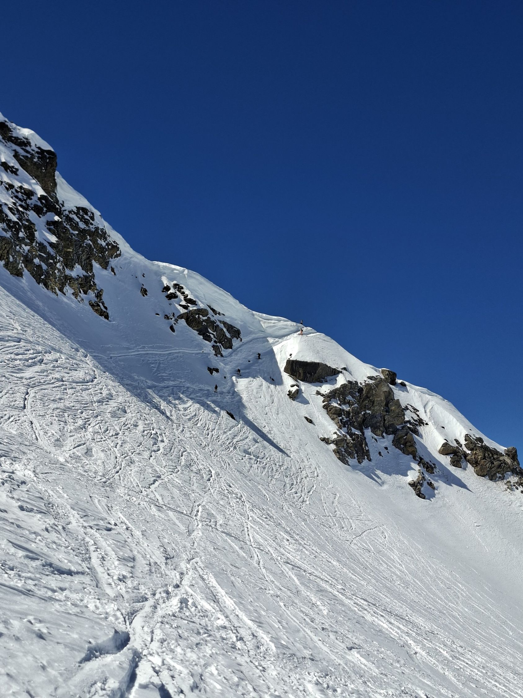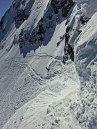 Abfahrt: Vom Gipfel bis zum Früestücksplatz war der Schnee meistens hart. Bei der Schlüsselstelle Früestücksplatz kann man vorsichtig abrutschen. Von da bis zur Engstligenalp ist alles komplett verfahren mit wechselhaften Schneeverhältnissen.