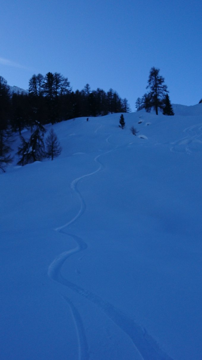 Da schattseitig, wird sich der Pulver unterhalb 2400m bis ins Dorf runter noch etwas halten. Oberhalb des Waldes hat es auch noch genug Platz für neue Spuren, in der Waldschneise (Wildschutzgebiet beachten) ist alles schon ziemlich verfahren.