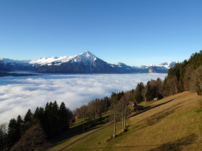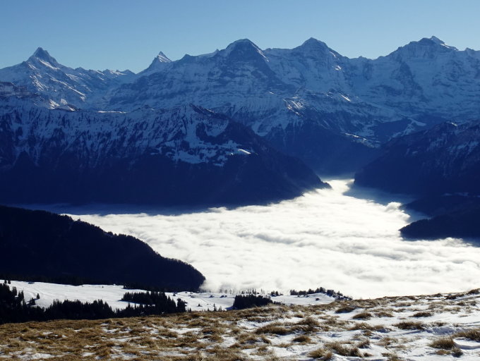 Wir wollten etwas mit Schneeschuhen unternehmen, lawinensicher und leicht erreichbar. der Burgfeldstand ist dazu ideal. Bei diesem Wetter und dieser Landschaft eine sehr gute Idee, nur wir waren nicht die Einzigen die eine solche Idee hatten. Auf dem Niederhorn herrschte Gedränge, man musste anstehen. Der Knoten löste sich, als viele Leute Richtung Vorsass und Waldegg gingen und Einige stiegen wie wir zum Burgfeldstand auf. So verteilte sich die Menge und bei diesem Wetter sah man nur fröhliche und zufriedene Gesichter.