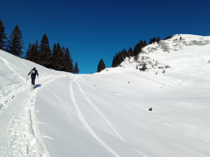 Aufstieg auf einer breiten, sehr gut ausgebauten und meist gefrorenen Spur bis zum Gipfel. Ging aber ohne Harscheisen.