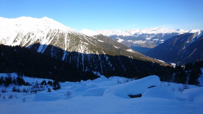 Statt mit Postauto nach Lü, sind wir ab Skilift Minschuns gestartet. Abfahrt oben zuerst mit Harstdeckel und verblasen, schliesslich noch etwas Pulver bis zum Winterweg nach Lü (kurzer Gegenanstieg bei Alp Champatsch).