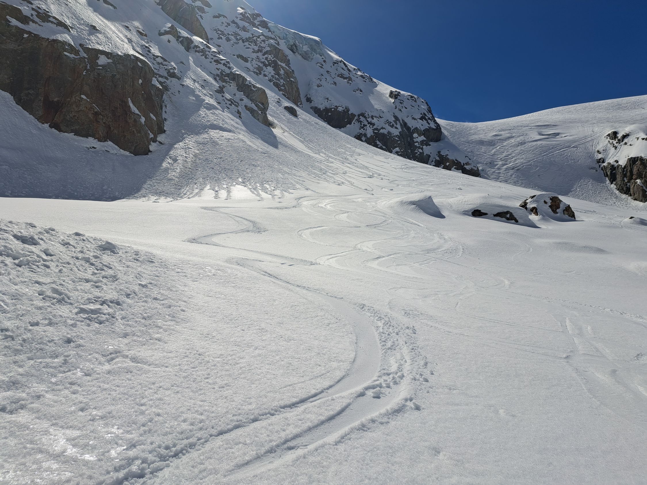 Abfahrten alle Schneearten von Hart griffig über Pulverschnee dann wieder schöner Sulz und unterhalb 2400m noch bremsschnee