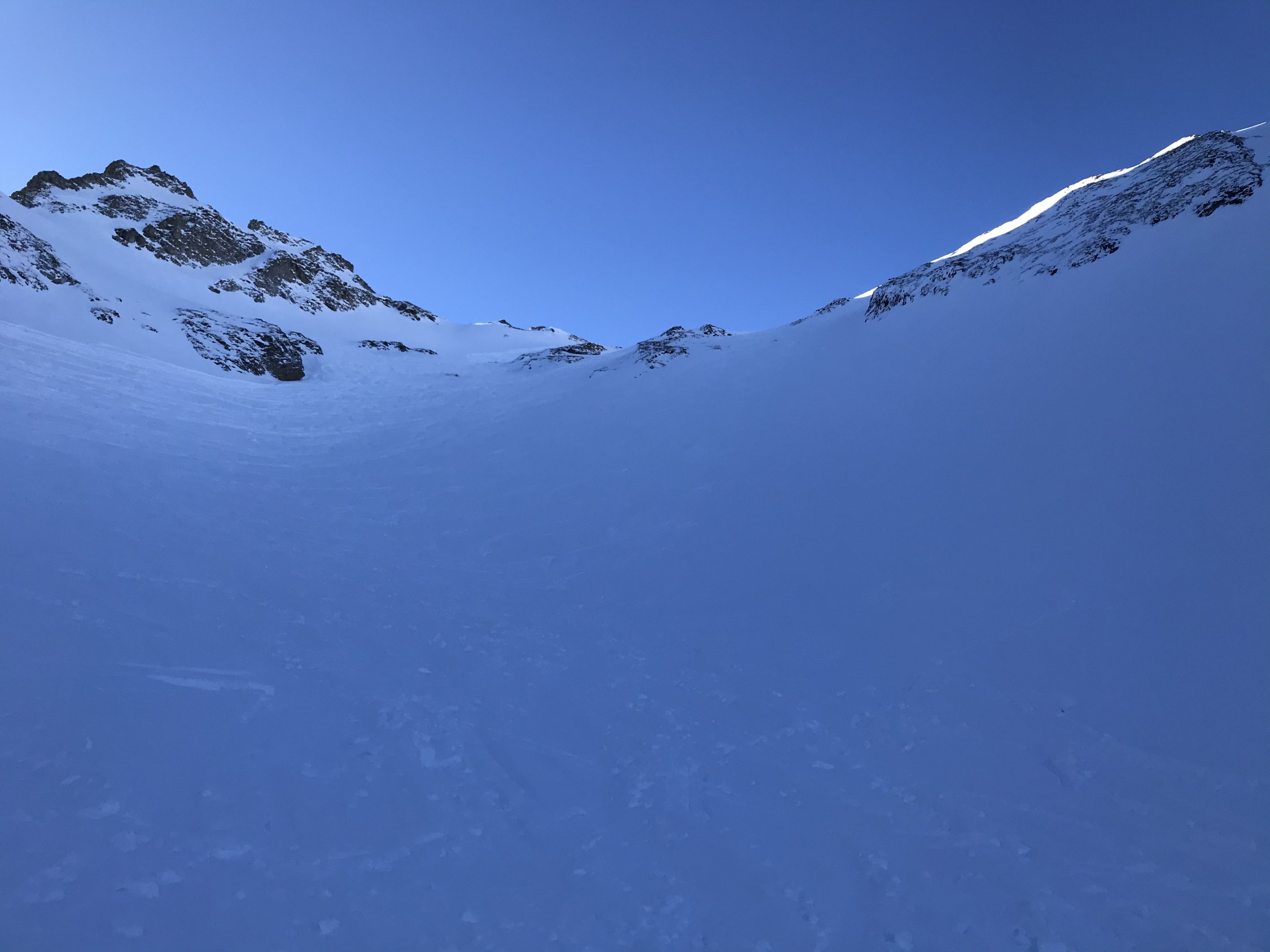 Joch westseitig wie üblich tlw. abgeblasen, zur Abfahrt am besten abfellen, da Schnee recht hart. Ist mit Fellen ein blödes Geeiere ...