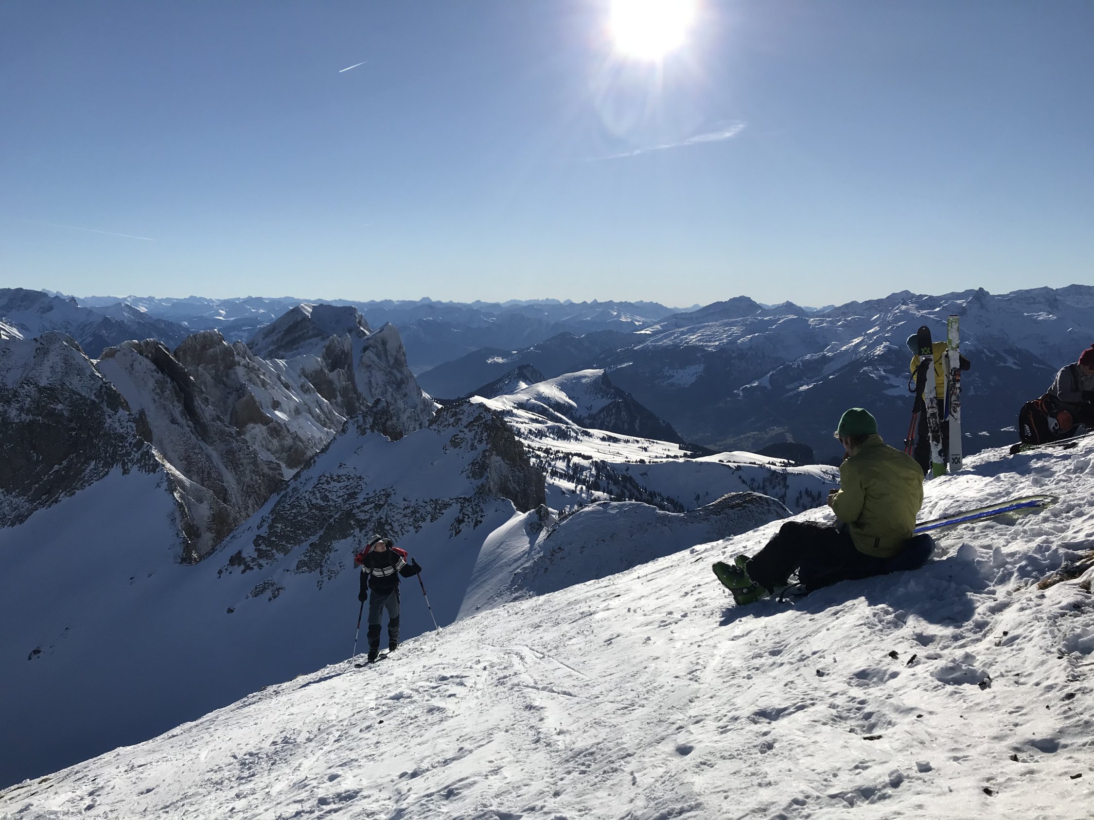 Es herrschen Frühjahrsverhältnisse. Nach klarer Nacht sonnseitig harschig, schattseitig bester Pulver, man findet noch unverspurte Stellen. Daher vom Wiederanfellplatz nochmal zum Gipfel aufgestiegen, da die schattseitigen Pulverhänge ein Traum waren. (Am besten vom Gipfel kurz nach SE abfahren, dann kommen die schönen Hänge.)