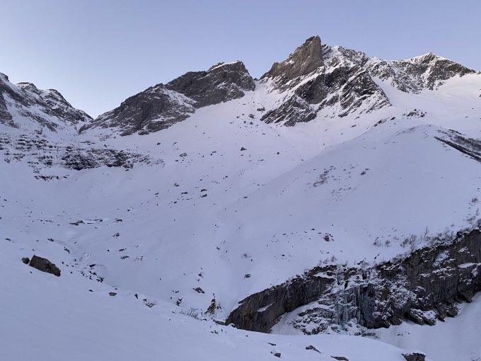 Der Gipfelhang im Hartschnee kein Genuss aber gut machbar. Auf etwa 2500 Wiederaufstieg zur Chären und zum Chalchhorncouloir abfahrend traversieren. Hier nochmals mit Fellen in die Scharte. Ich erwische die Scharte einige Meter zu weit links und steige ein paar Meter zu Fuss ab. Im grossen Hang zwei Abfahrts- und eine Aufstiegsspur, wahrscheinlich von gestern. Mehrheitlich pulvrig aber nicht mehr top, teils auch gedeckelt. Im Bereich Lochhüttli knapp Schnee (Steine).