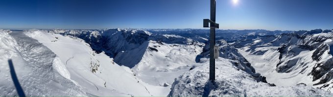 Start in Wichlen. Erst 5 Abfahrtsspuren ausgemacht. Eine Zweiergruppe ist eine gute Stunde vor mir gestartet. Ich hole sie beim Panixerpass ein. Erstaunt stellen wir fest, dass der Gipfel noch unverspurt ist. So komme ich in den Genuss zu spuren. Teils pulvrig, teils hart, teils anstrengend zu spurender Bruchharst.