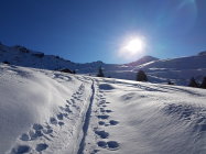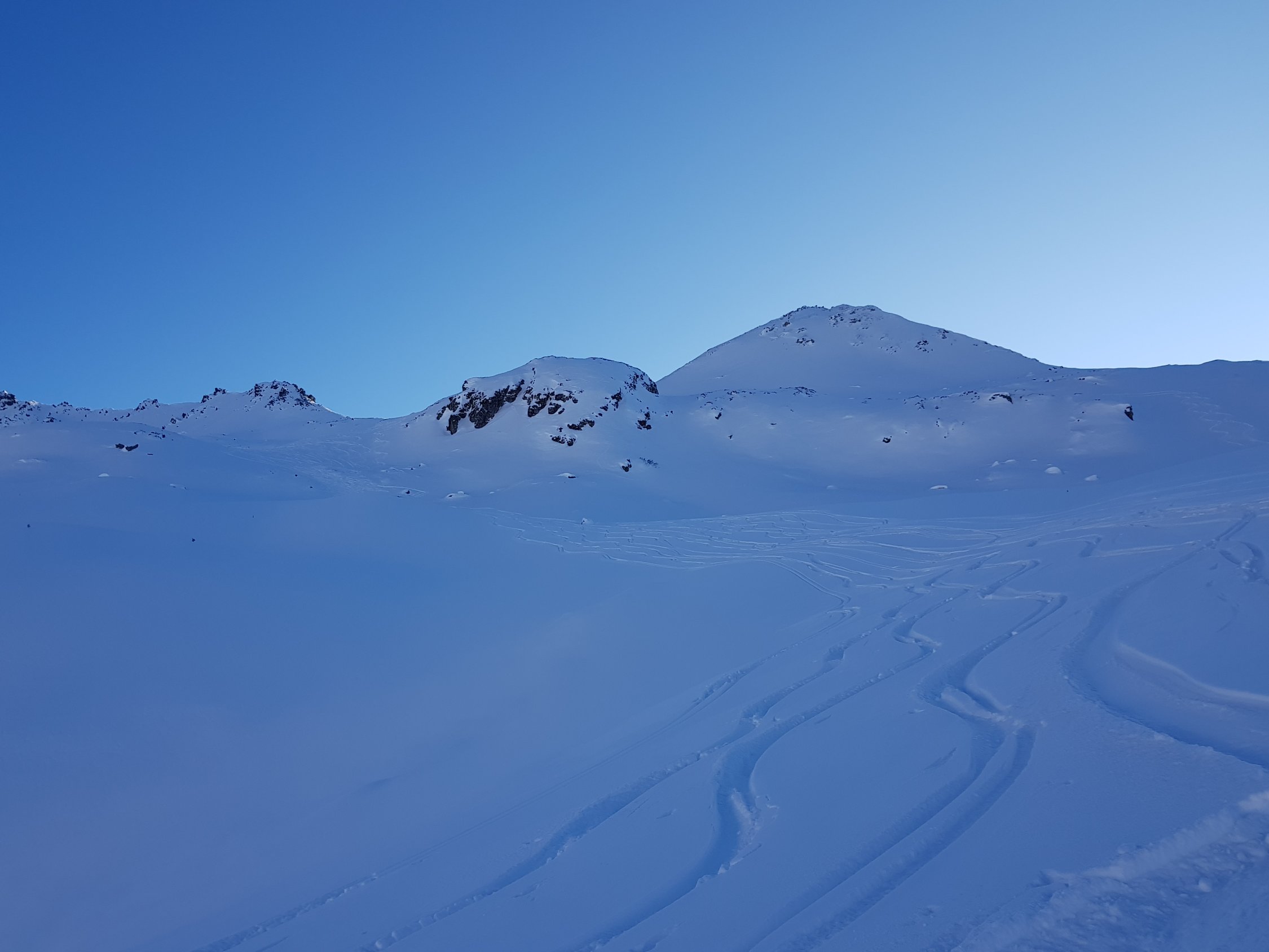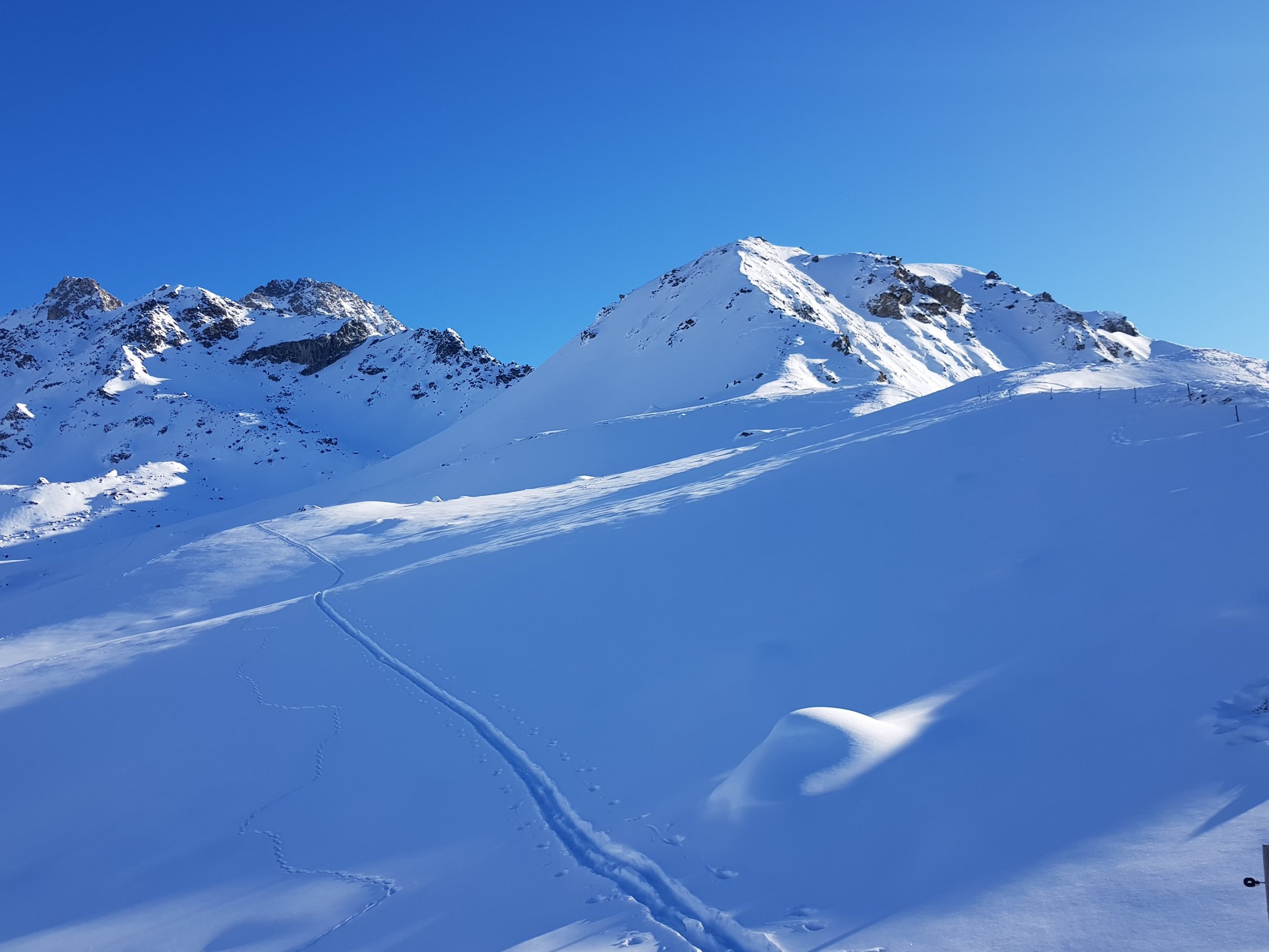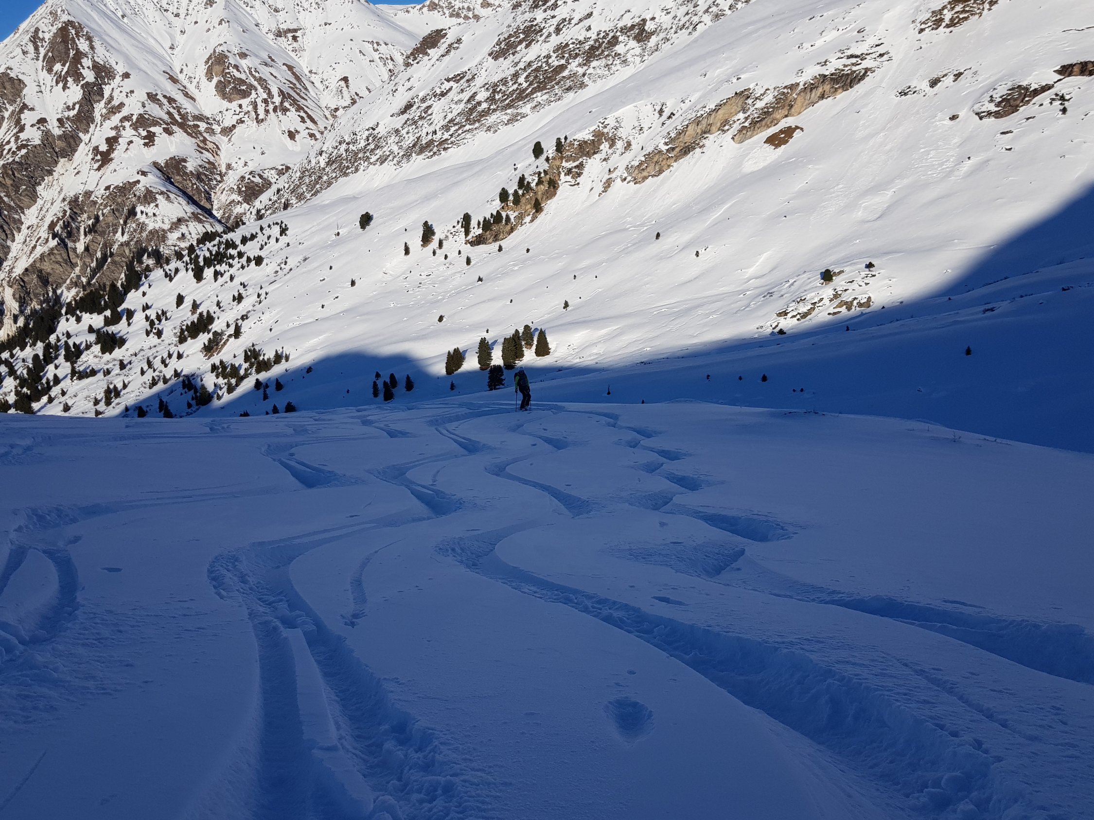 Forststrasse von Tinizong bis Jäger-Parkplatz geräumt, von dort bis Cruschetta geplättete Schneeunterlage, ideal für Aufstieg und Abfahrt. Auf der Fahrstrasse liegt zum Glück ein Baum, so dass keine Autos nach Tgant Pensa fahren können und die Schneedecke nicht kaputt machen. Ab Cruschetta fast nur noch Pulver bis zum Gipfel. Es hat noch viel Platz für eigene Spuren!