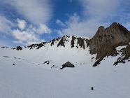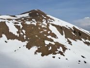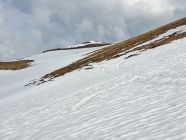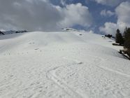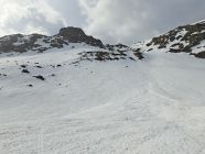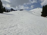 Abfahrt N-Flanke oben mühsam mit Harschdeckel teils brechend und darunter Nasschnee.