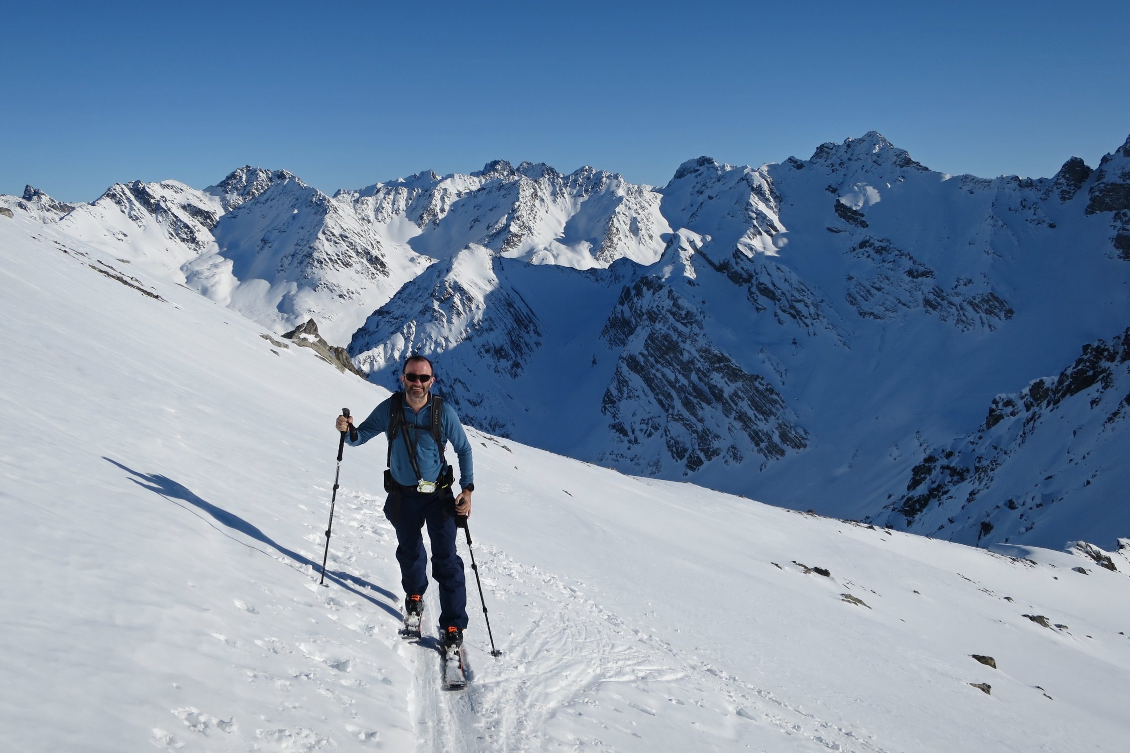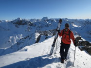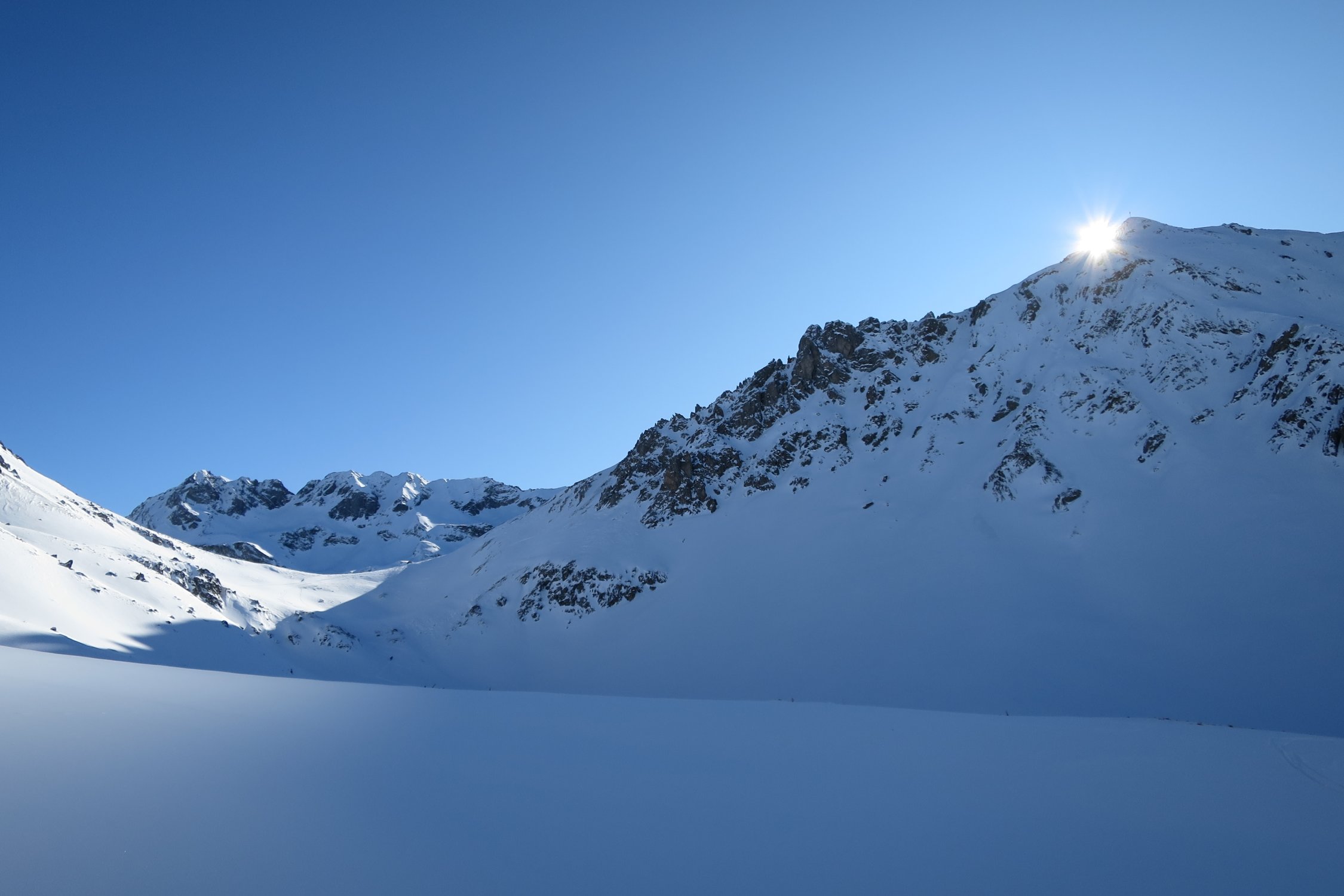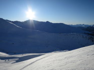 Abfahrt Richtung Westen, noch recht guter Pulver, z.T. mit leichtem Deckel. Schon einige Spuren von den Vortagen. Insgesamt war es superr.