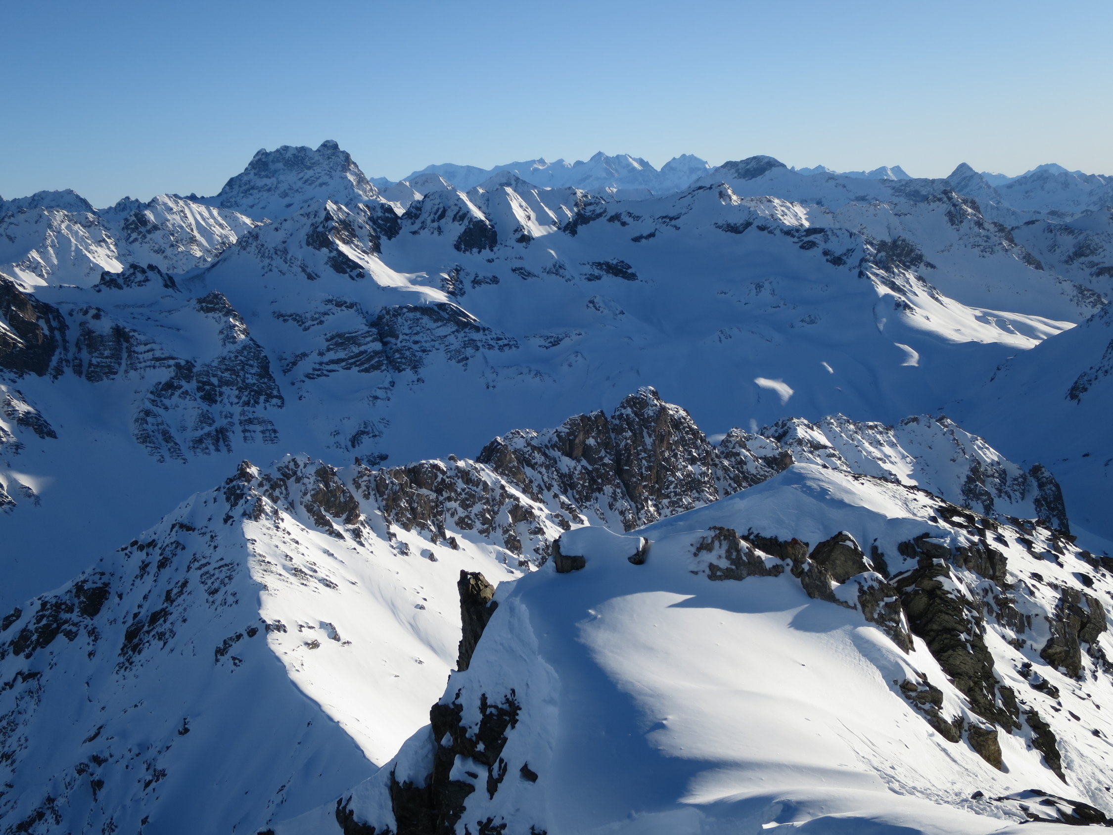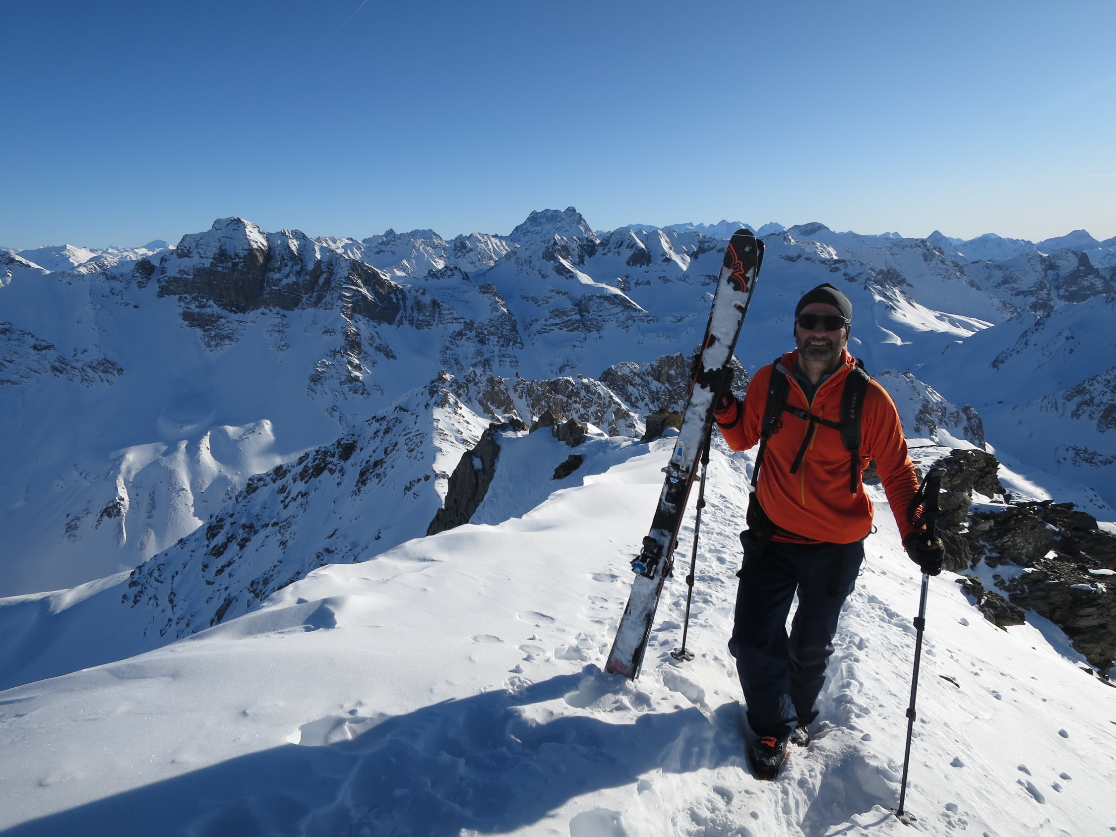 Um 10.00 ab Monstein. Aufsteig auf Normalroute. Am Anfang recht kalt, in Südost Flanke dann frühlichhaft warm. Mit kurzer Kraxelei auf den Gipfel. Waren alleine oben!