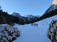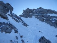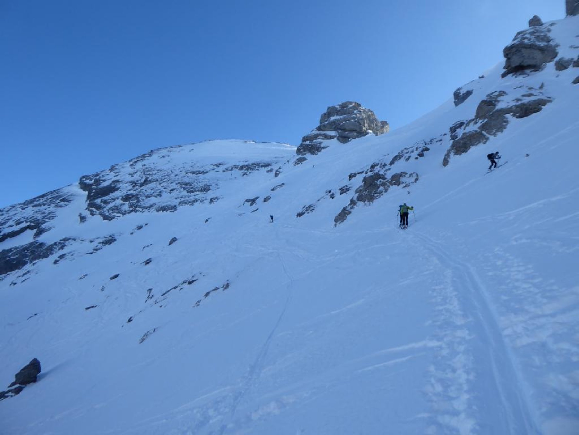 Sehr gute Spur. Nur kurz unterhalb des Sattels wegen Wind mit Seifenschnee gefüllt, ansonsten griffig.
