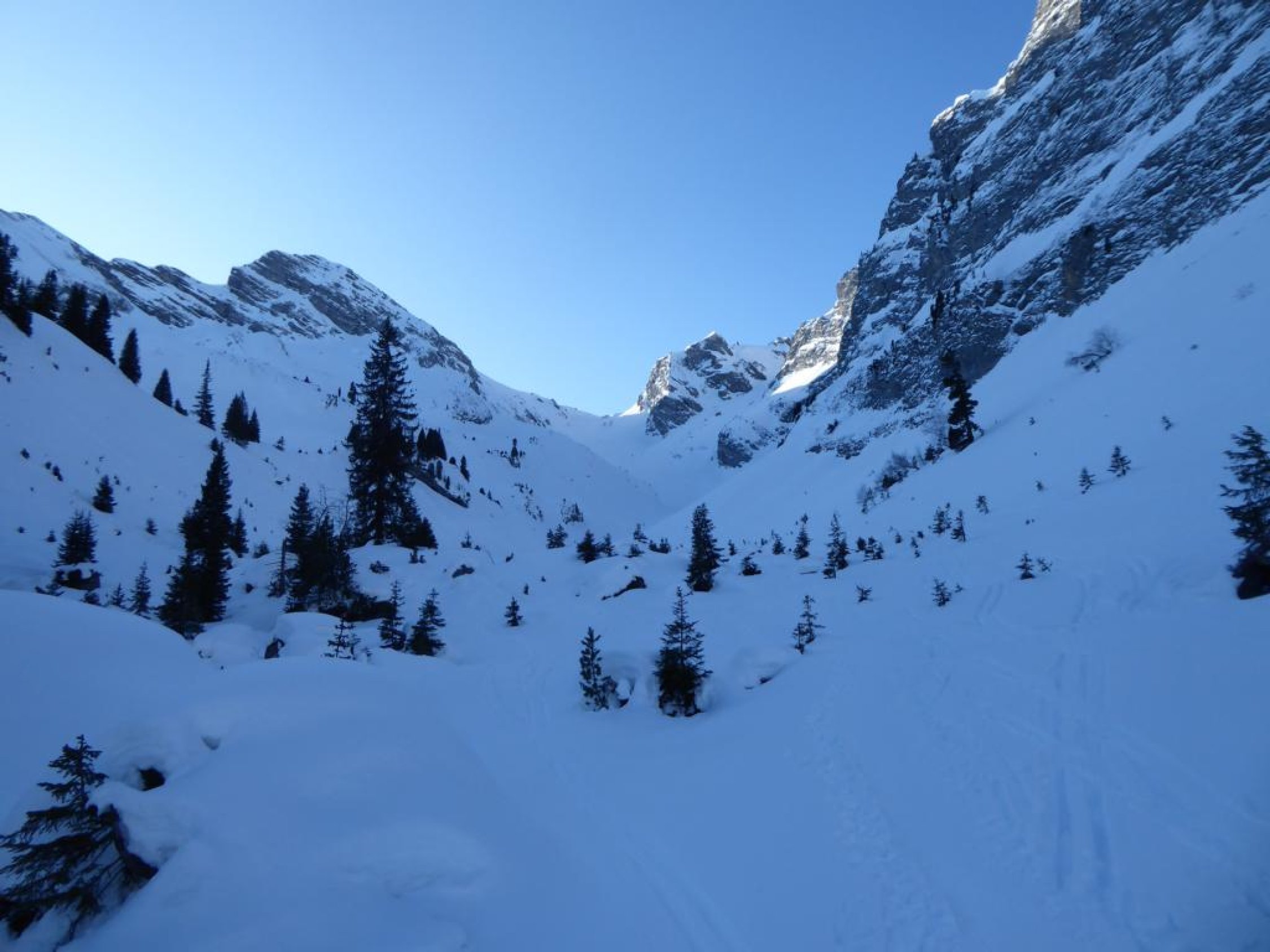 Immer noch Pulverschnee im ganzen Gebiet, teilweise etwas Windeinfluss. Weil aber arg verfahren, nur noch "gut". Ich bin nach einer ersten ziemlich holprigen Abfahrt bis ca. 1900 noch mal fast zum Sattel aufgestiegen und habe die Traverse Richtung Pt. 2128 genommen, da vom Gipfel aus sichtbar war, dass die Hänge von dort aus noch kaum Spuren hatten. Das war ein guter Entscheid und bot doch noch Pulvergenuss bis ins Wildgrimmital.