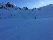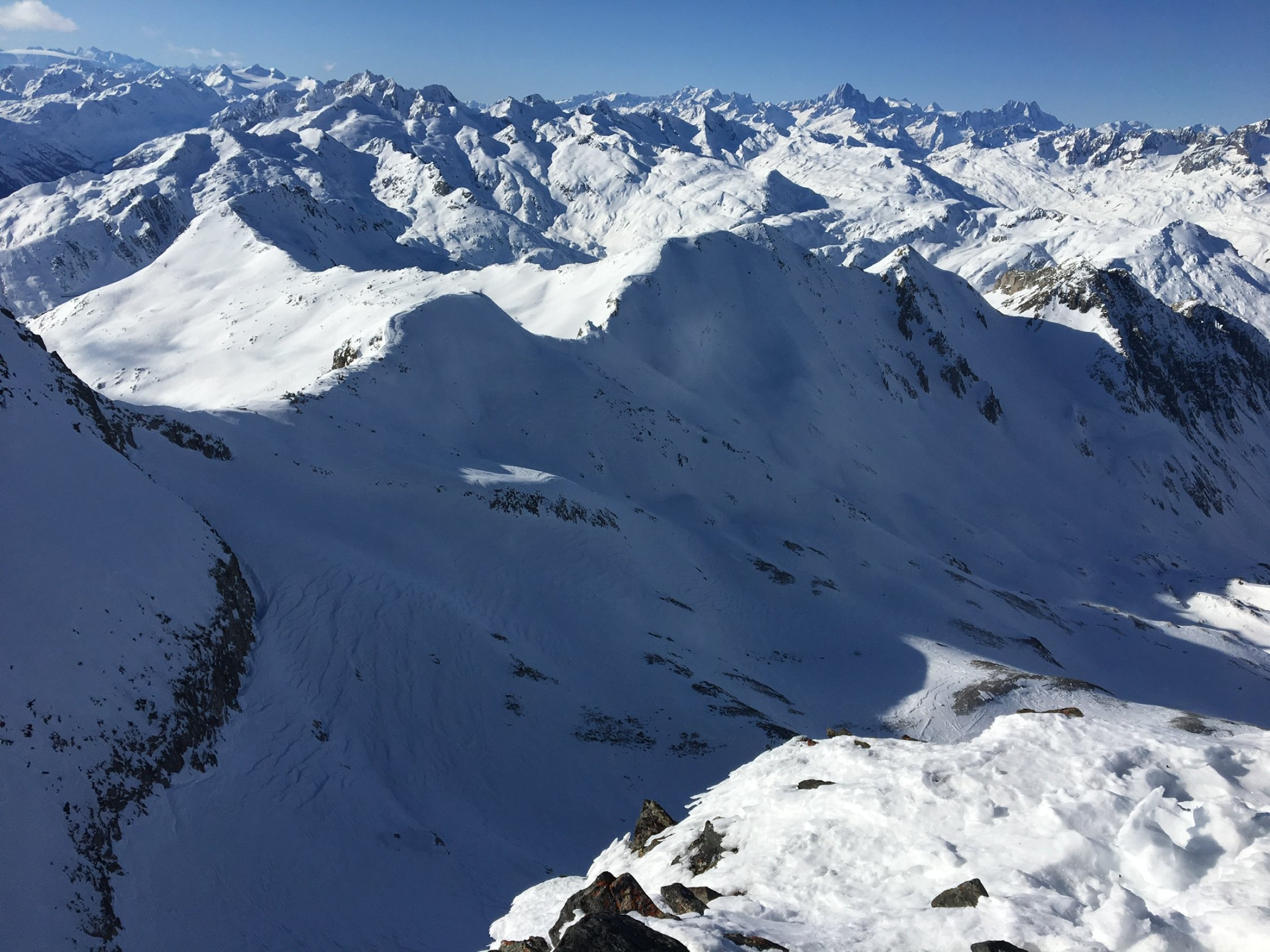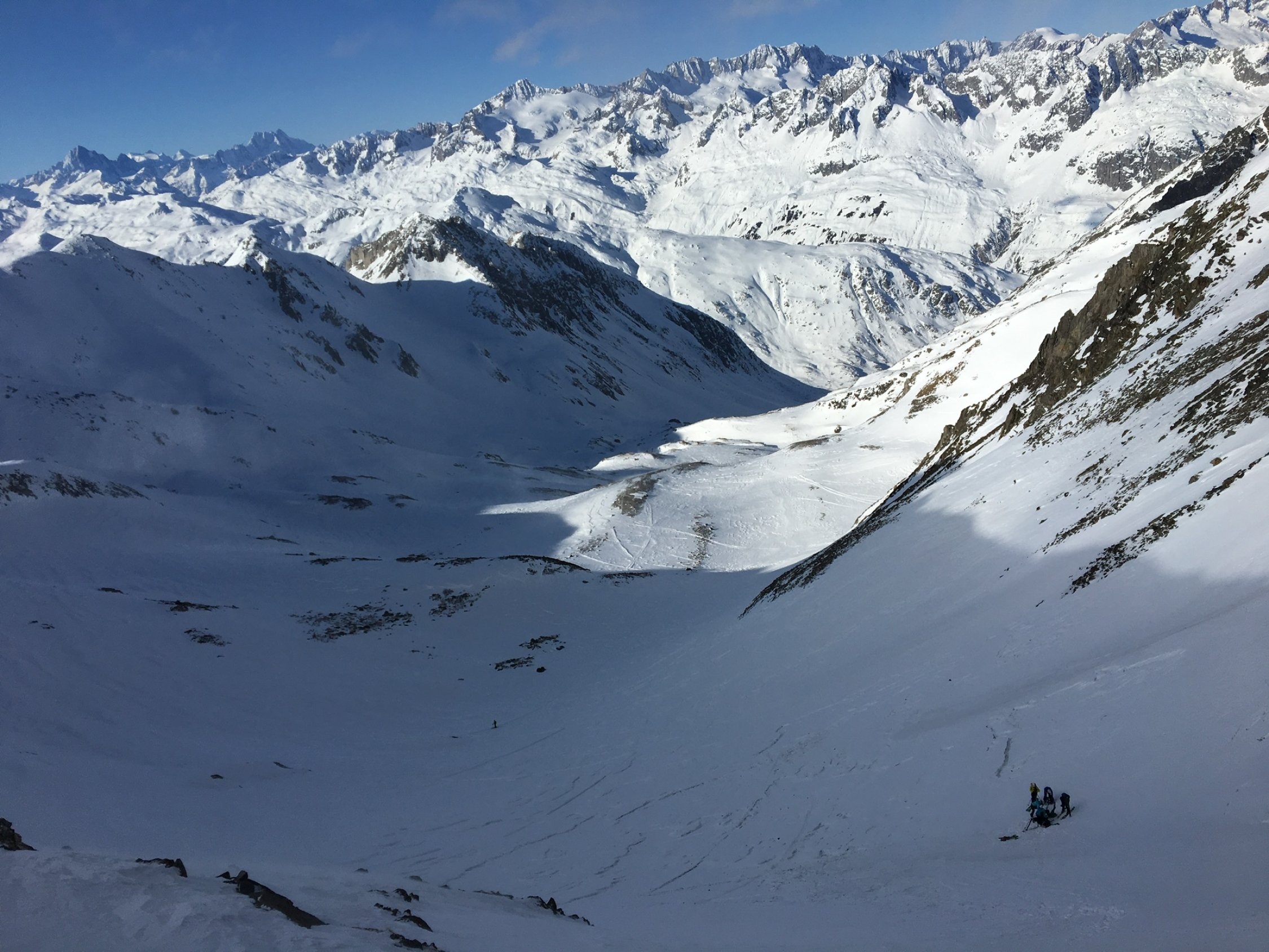 Im Guspistal bis gegen 2000 m noch schön pulvrig, dann begann der Föhn aufzudrehen. Offensichtlich hatten wir gerade das Gebiet bevölkert, welches der Föhn für sich beanspruchte. Im Bereich unter dem Rotstock (P 2672) dann bereits etwa 70 - 80 km/h. Im Skidepot unterhalb Guspissattel dann Balancearbeit. Lediglich einige Meter unterhalb des Sattels im Windschatten etwas Ruhe, dafür tobte am Sattel der Föhn umso stärker. Am Gipfel dann nur noch mässiger Wind. Die geplante Umrundung des Centrale liessen wir dann bleiben, wir waren bedient.