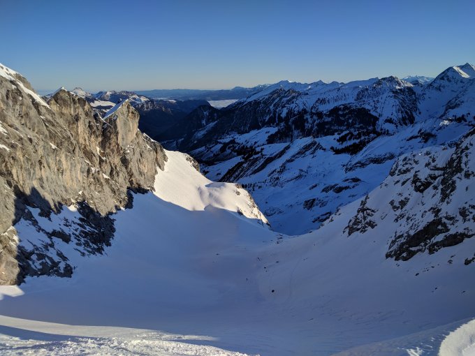Start bei kalten -5 Grad um 6:00. Aufstieg bis zum Rothornsattel, Abfahrt bis 2000m, danach auf die Spillgertenschulter. Oben meist guter Pulver, vor allem an der Spillgerte, unten Piste. Die Schätzung bezüglich Personen bezieht sich auf die Heerscharen, die mir auf der gesamten Abfahrt entgegen gekommen sind.