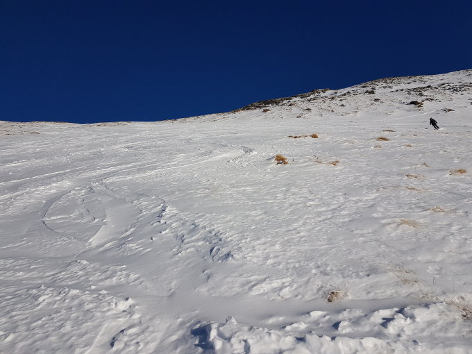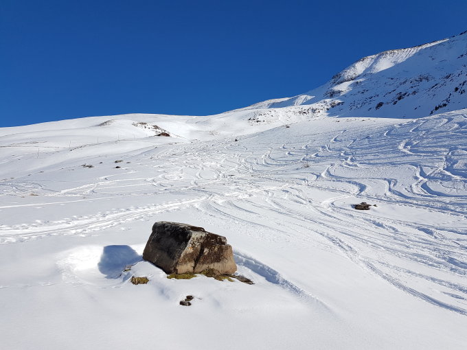 Ab Alp Honiesen konnten wir die Sonne geniessen. Der Schnee ist bis auf den Gipfel knapp, die Südwesthänge beginnen aufzusulzen, Nordwest bietet Presspulver. Es gibt verhältnismässig wenig Spuren.