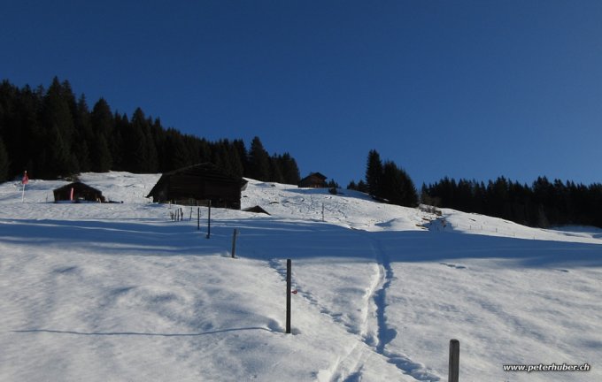 Strahlend schönes Wetter. Es hat gerade genug Schnee ab der Kapelle. Der Schnee war recht feucht. Oben auf den Rücken abgeblasen. Doch in den Mulden genügend Schnee.