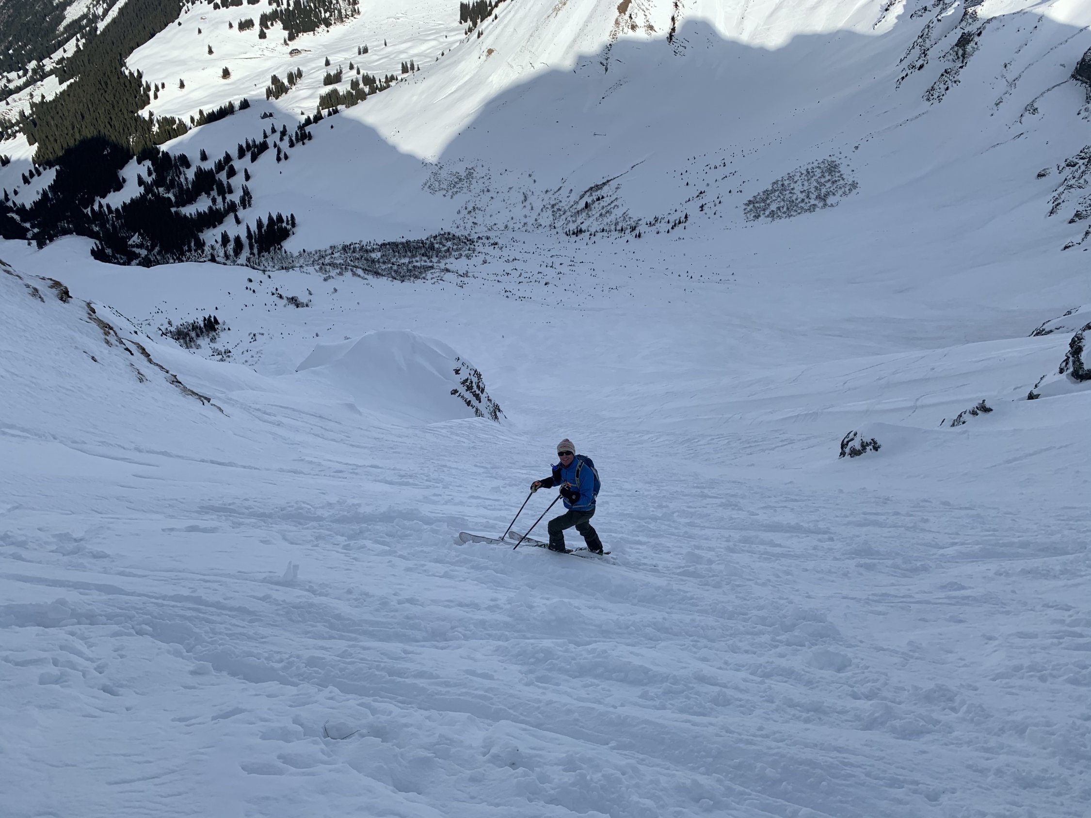 Die Abfahrt ab Gipfel bis Steilhang hart und pistenähnlich, hier ist etwas auf Steine zu achten. Im Steilhang selbst wechselnde Schneebedingungen, zuoberst verfahren, dann teilweise Pulver abwechselnd mit Windharsch. Diese Bedingungen ziehen sich dann weiter durch den Steibode. Ab höhe Strasse dann pistenähnlich. Mit vorausschauender fahrweise kann Steinkontakt recht gut vermieden werden.