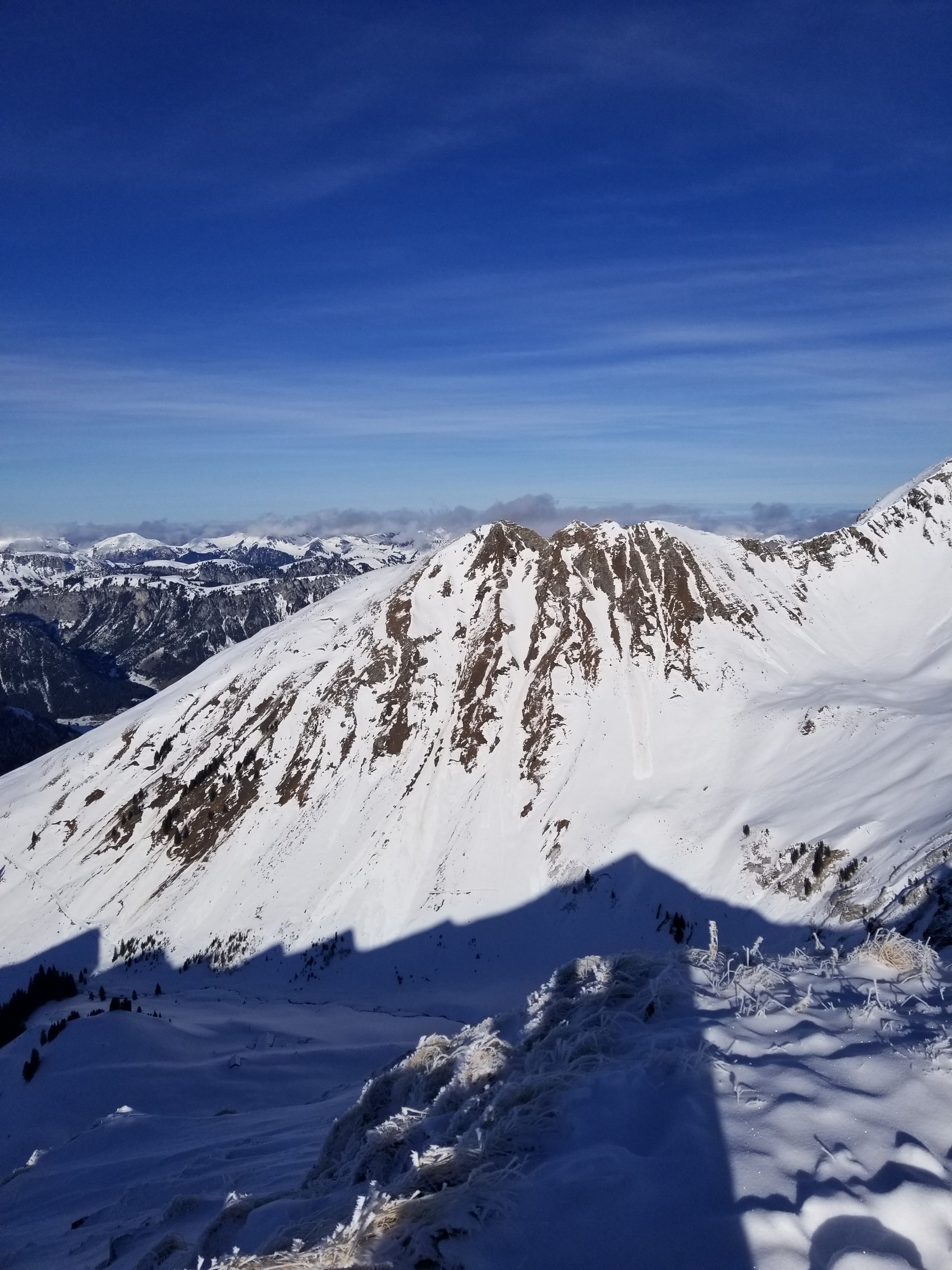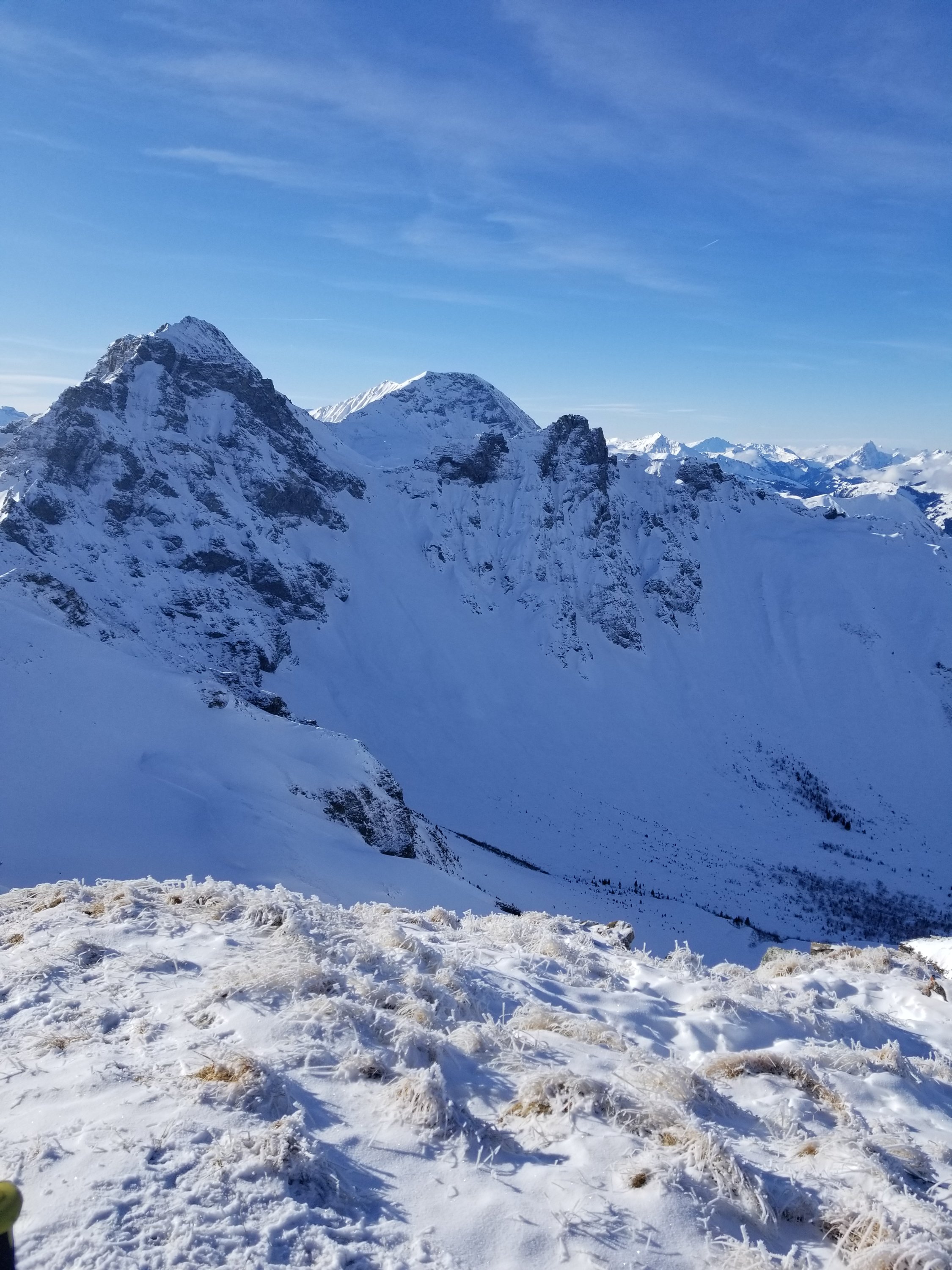 Schnee: Ab Start pistenähnlich in pulverähnlichen Schnee übergehend. Zum Teil windgepresste Stellen im Aufstieg auf den Drümännler. Die Abfahrt im Schattenhang in Richtung Bodezehore war noch recht pulvrig und gut zu fahren. Schöner Rundblick vom Gipfel!