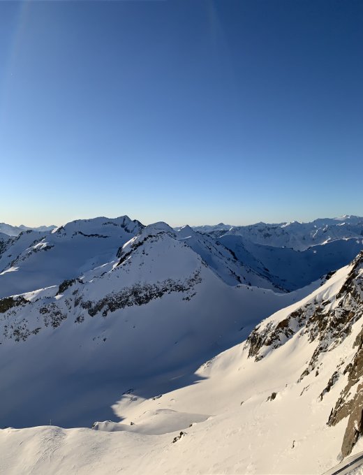 Schnee war durchgehend verblasen, harschig oder hart. Aber ansonsten ein super Tourentag - unten weiss oben blau...
