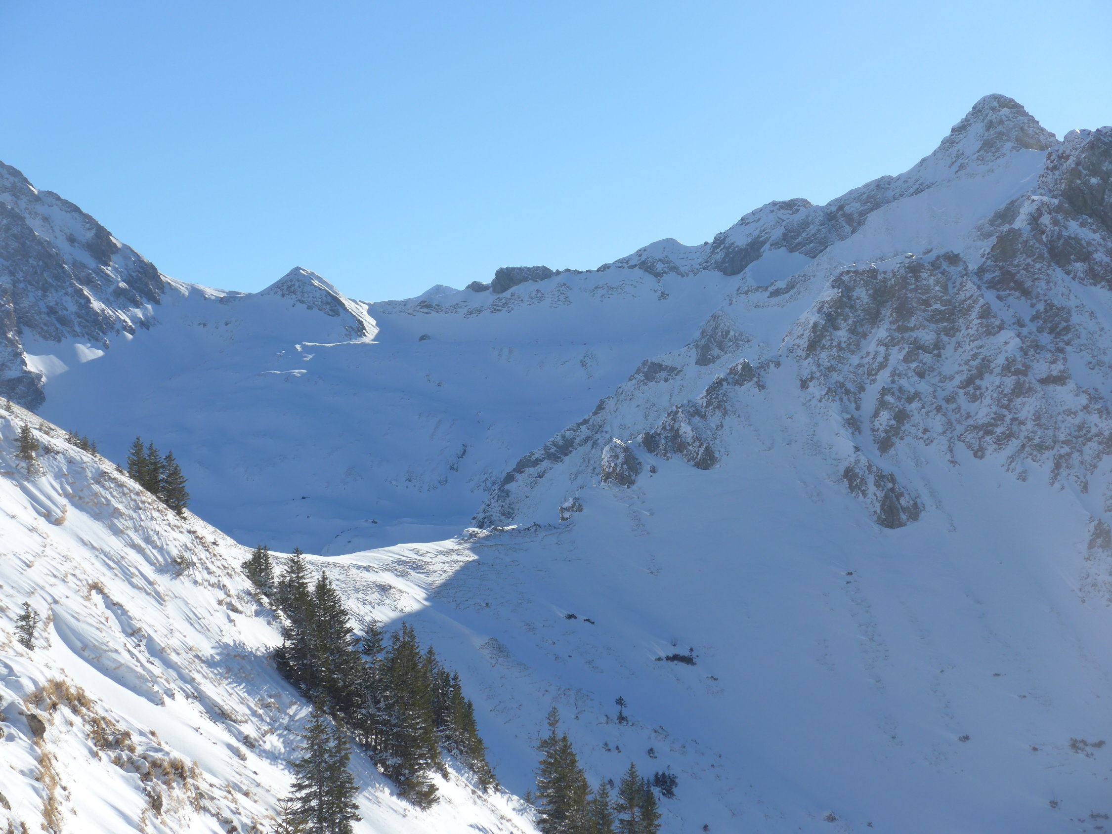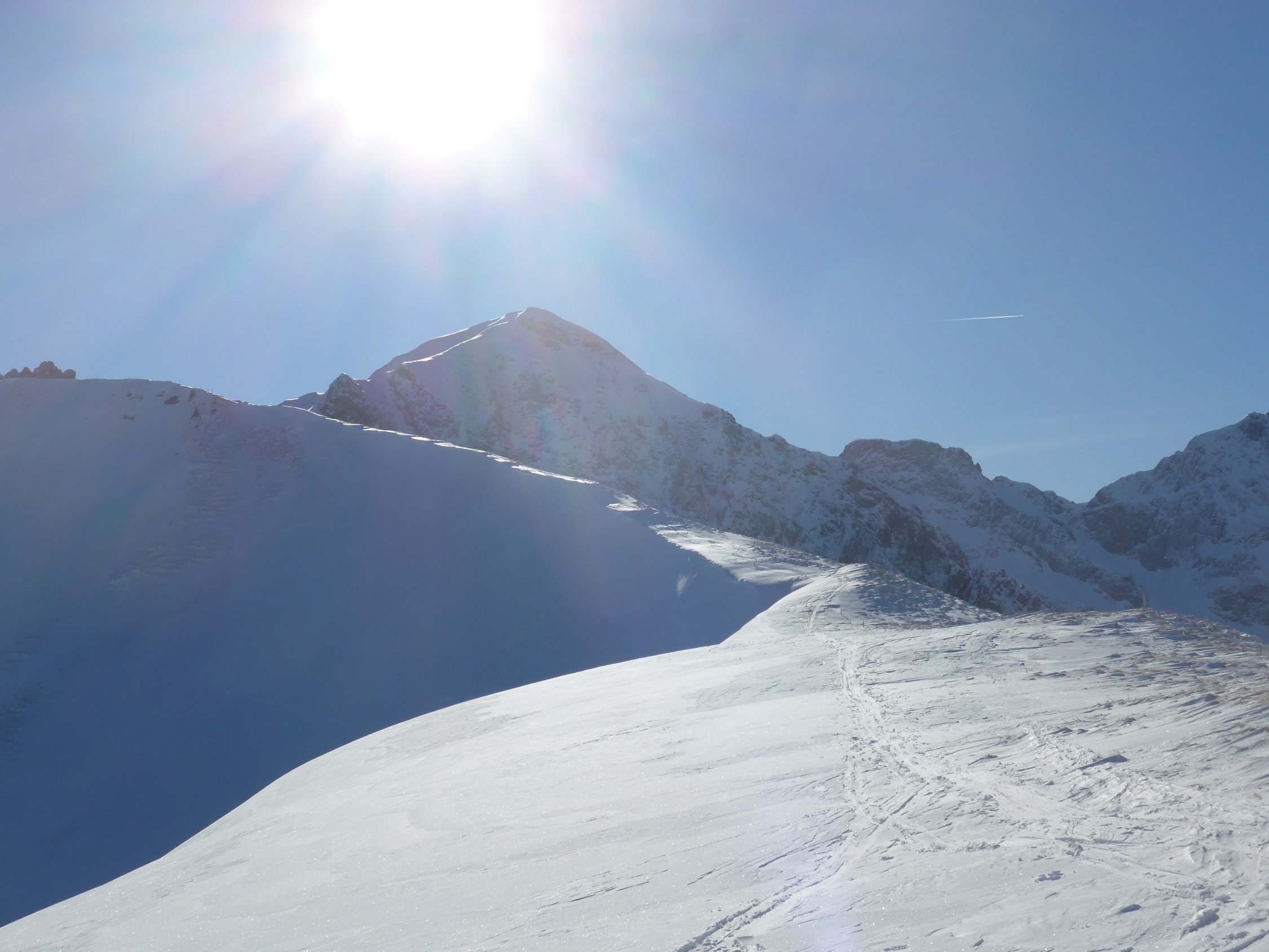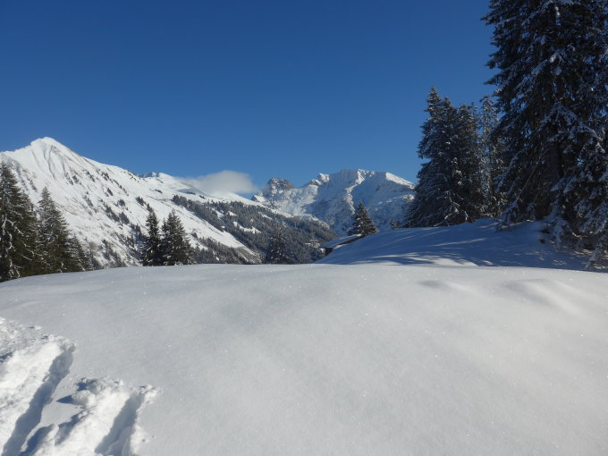 Sehr schöner Pulverschnee oberhalb der Gräsalpe. Nur der Ziehweg hatte apere Stellen. Strahlender Sonnenschein.