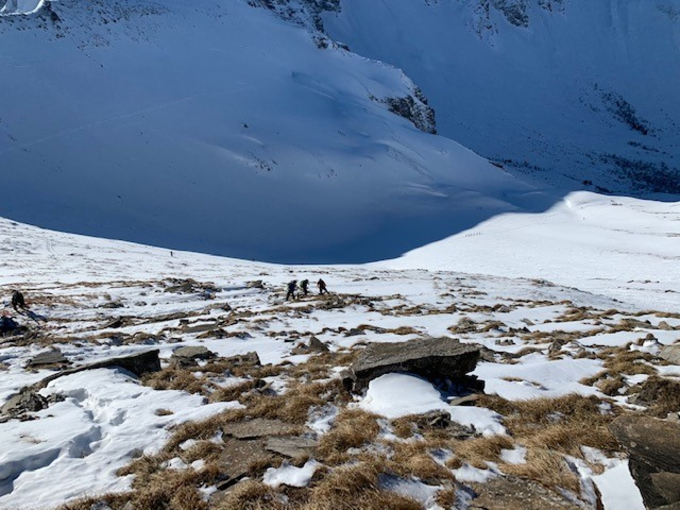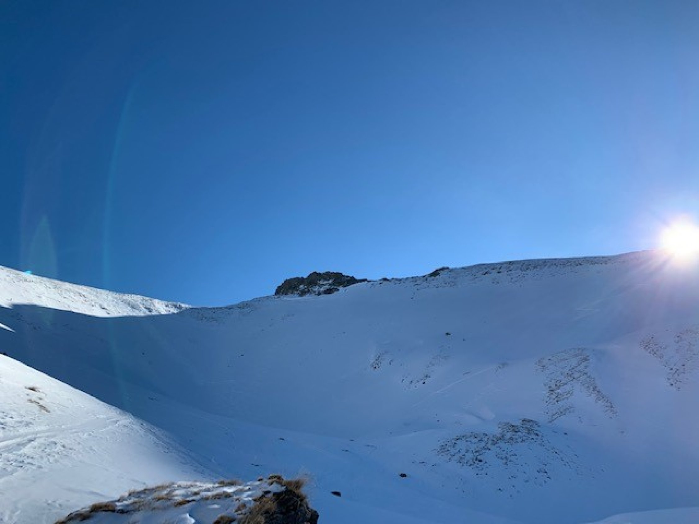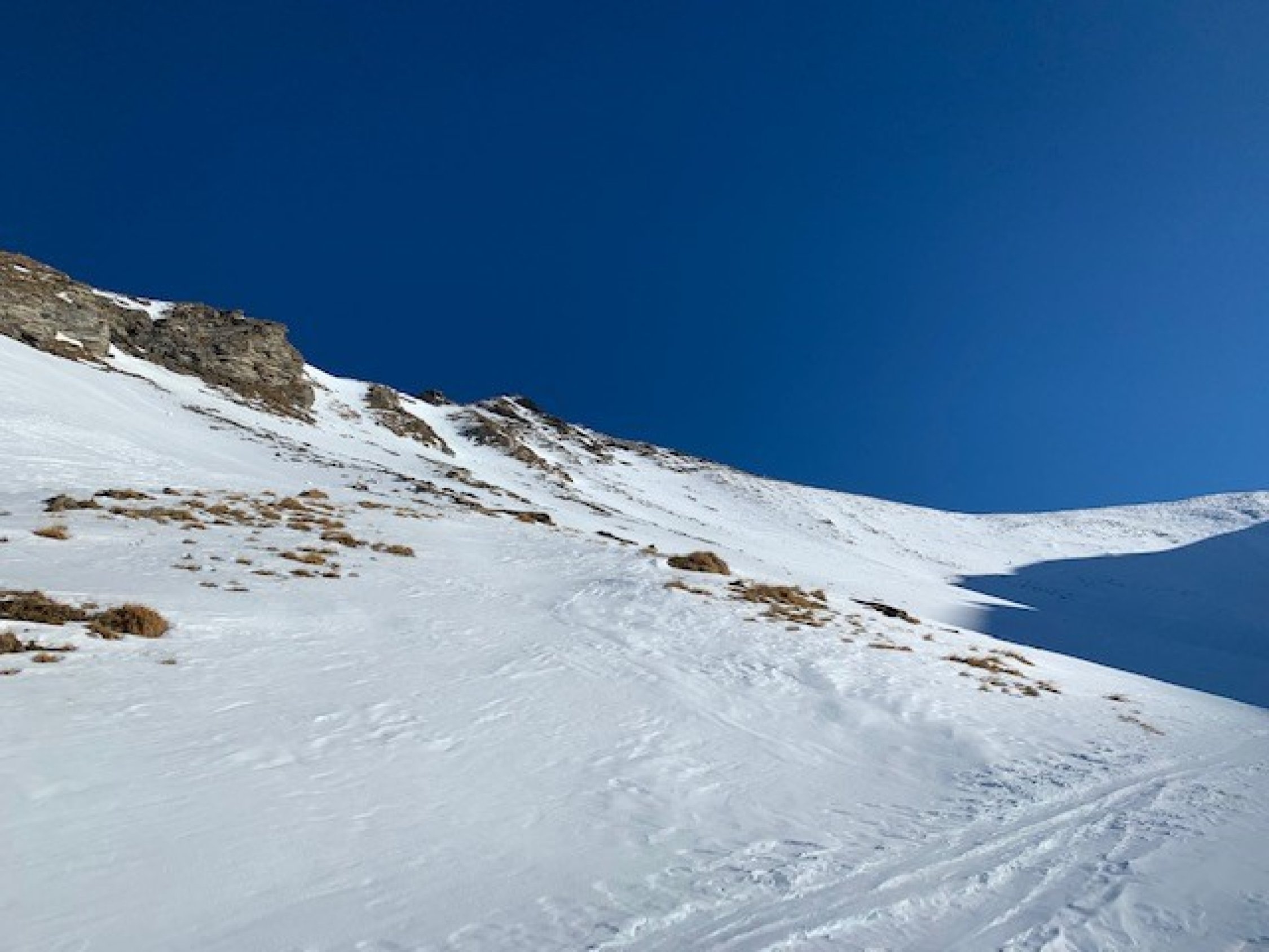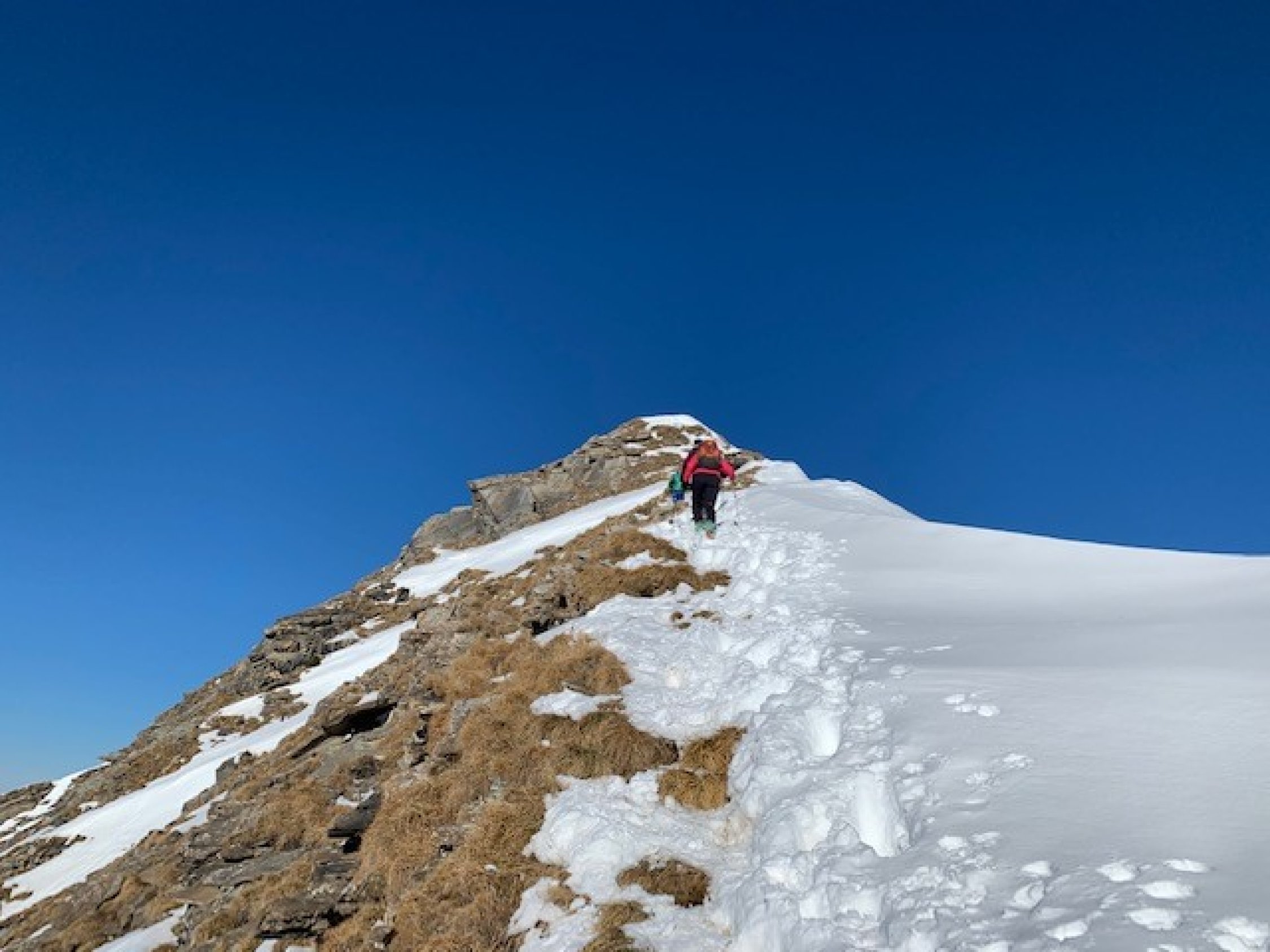 Die Beurteilung bezieht sich auf die momentanen Verhältnisse im Gebiet. Auf der ganzen Tour eine sehr gute Aufstiegsspur. Richtung Chummli ist die Montage der Harscheisen nicht falsch. Auf dem Grat ziemlich abgeblasen. Aufstieg zum Gipfel gut machbar.