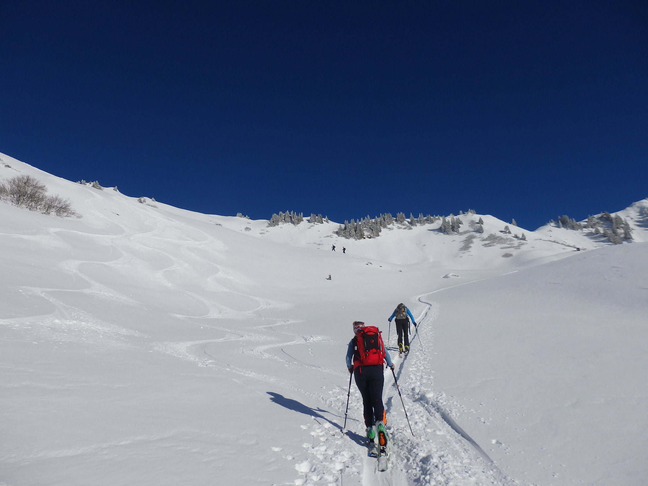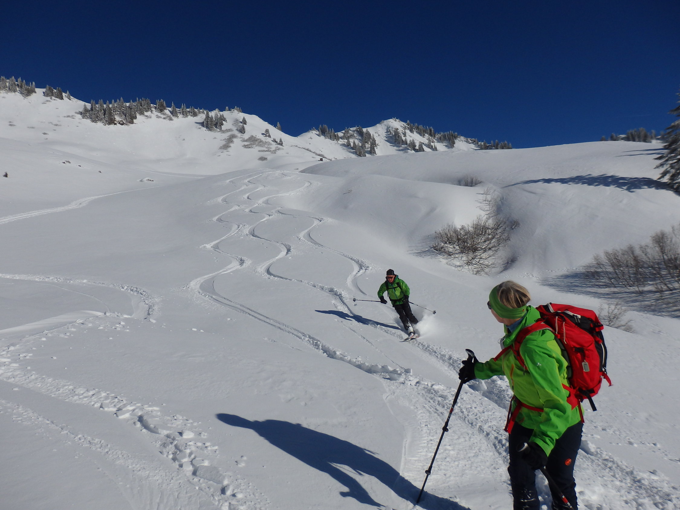 Mit dem heutigen Tag sind die gängigen Touren gut befahren worden, unbefahrene Hänge werden knapp. Die Schneeverhältnisse werden noch 2-3 Tage so bleiben.