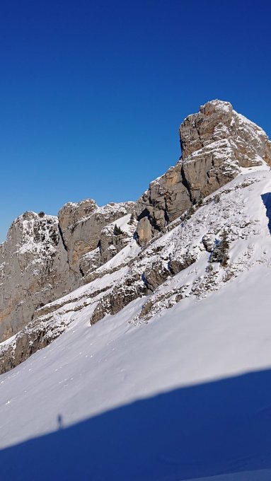 Aufstieg problemlos - bis auf die Traverse unter dem Kaiserstock. Die ganze Flange ist stark vereist. Hier lieber mit Harsteisen. Zudem könnte es heikel werden, wenn es drauf schneit und dann bei Belastung abrutscht.