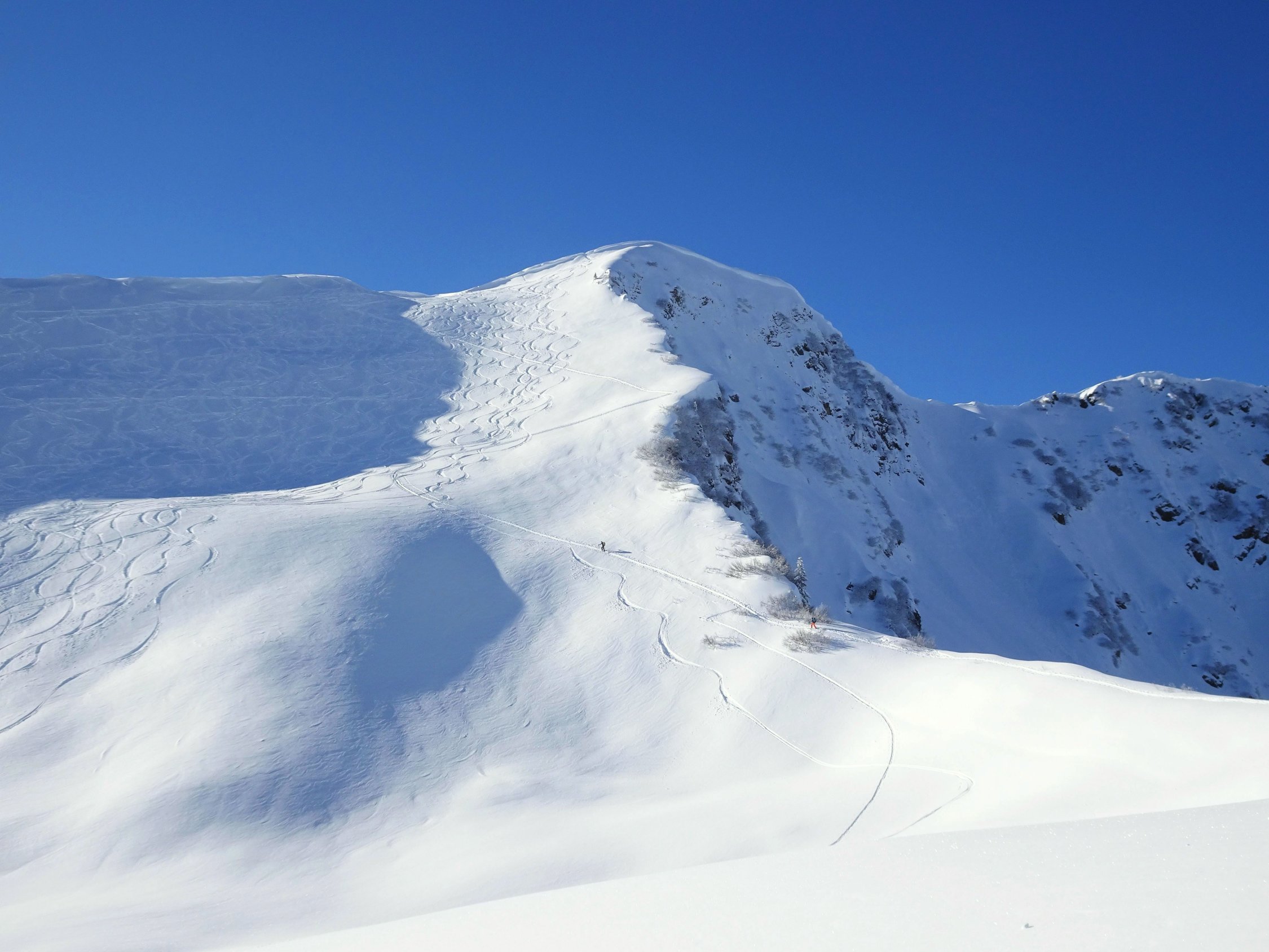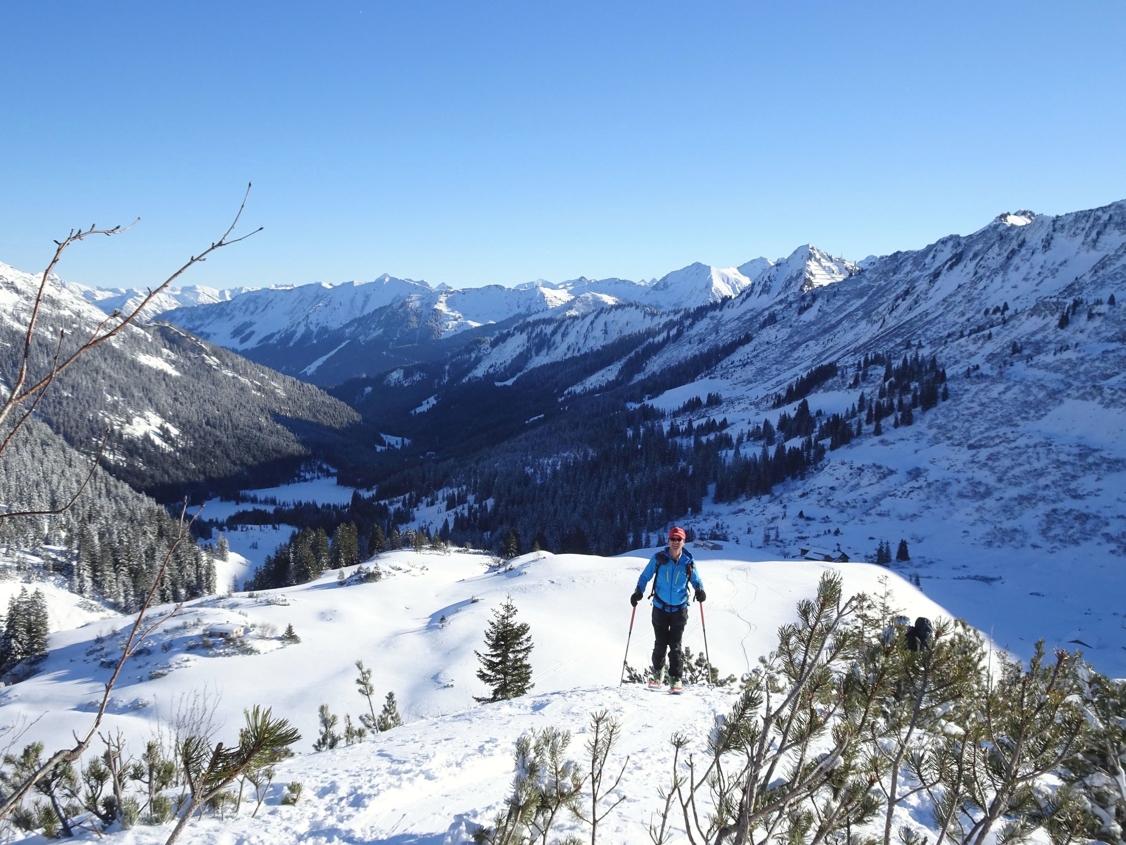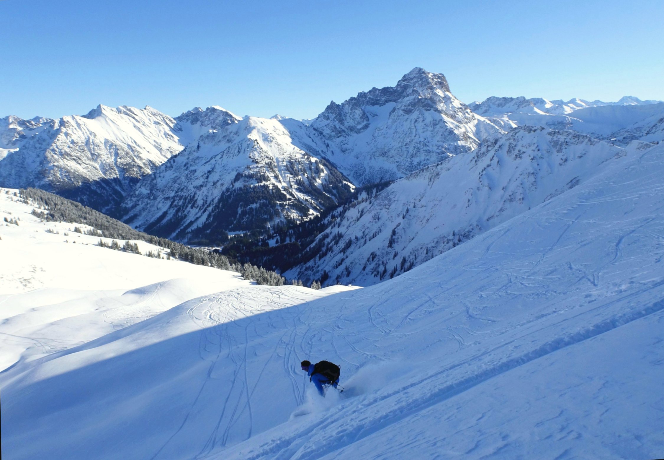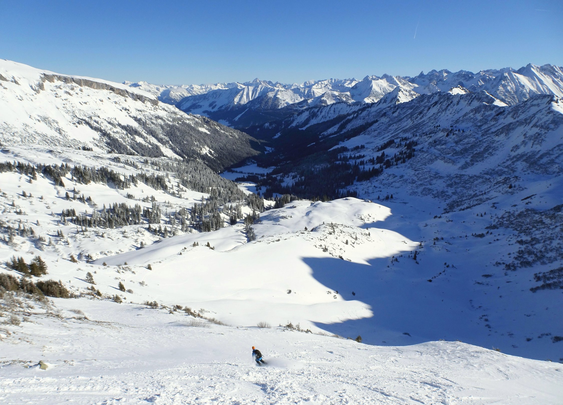 Am Grünhorn im Gipfelhang auch schwerer, Richtung Starzelalpe dann zunehmend lockerer Pulver. Ebenfalls sehr schön die Abfahrt von der Litzescharte zurück in´s Schwarzwassertal, bis ca. 1.500 m noch pulvrig, danach etwas ruppig.