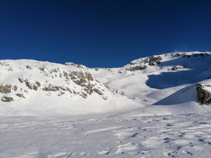 Aufstiegsroute stark verblasen, Hartschnee teilweise Bruchharsch. Das ganze Gebiet ist stark windbearbeitet. Super Wetter aber eisiger Wind. Für ee Gipfelhang waren Harscheisen von Vorteil.