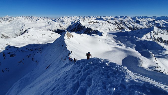 Die Hänge sind stark abgeblasen. Vor allem der Aufstieg zur Cristallina ist zum Teil sehr hart. Harscheisen sind sicher zu empfehlen. Wir hatten keine dabei und sind trozdem bis zum Grat gekommen mit den Ski (106mm).