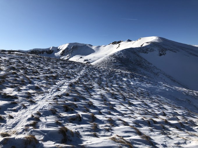 Gipfelcouloir ohne Pickel und Steigeisen so..so. Braucht etwas Nerven. Ketten sind aber frei.