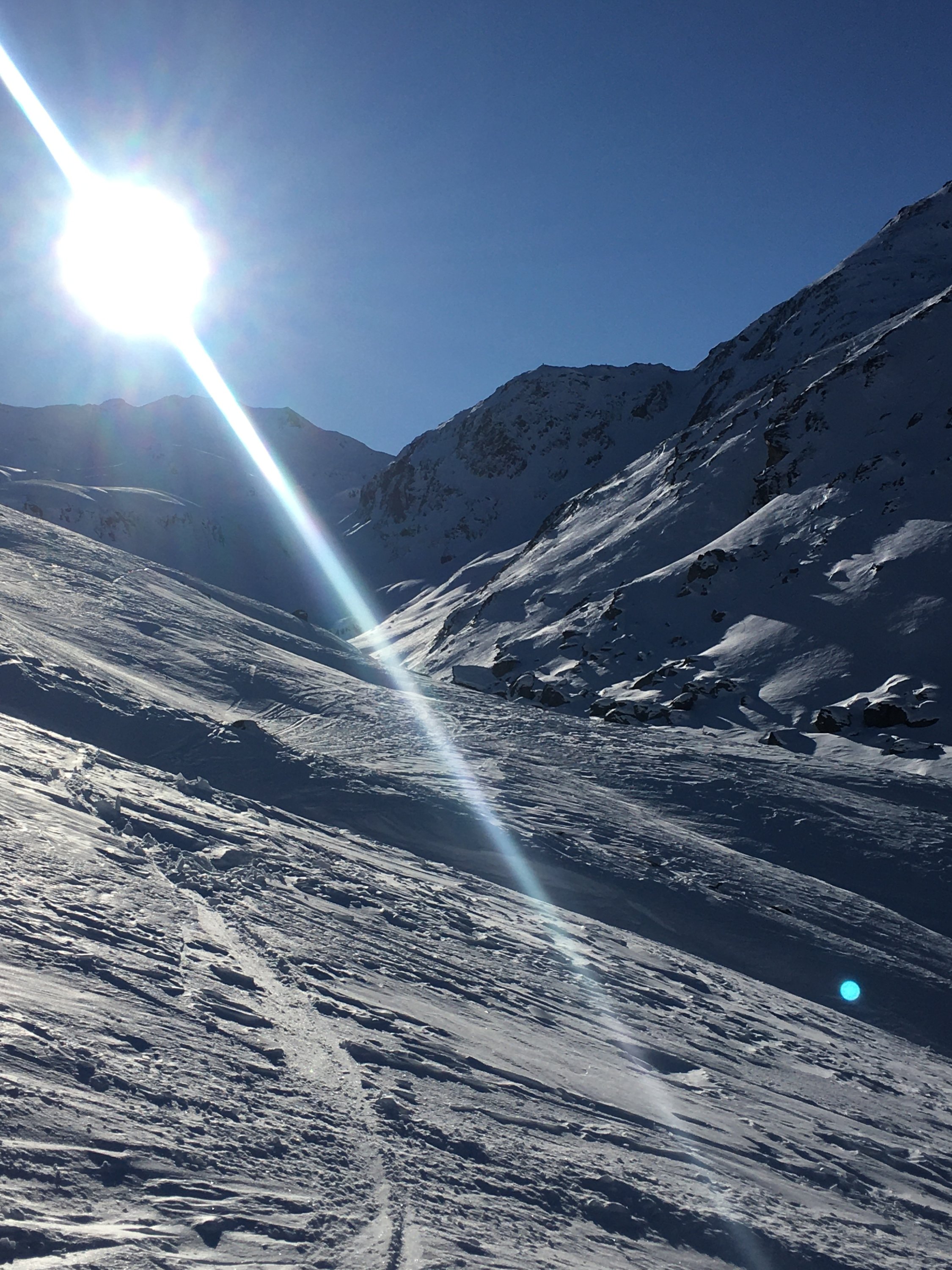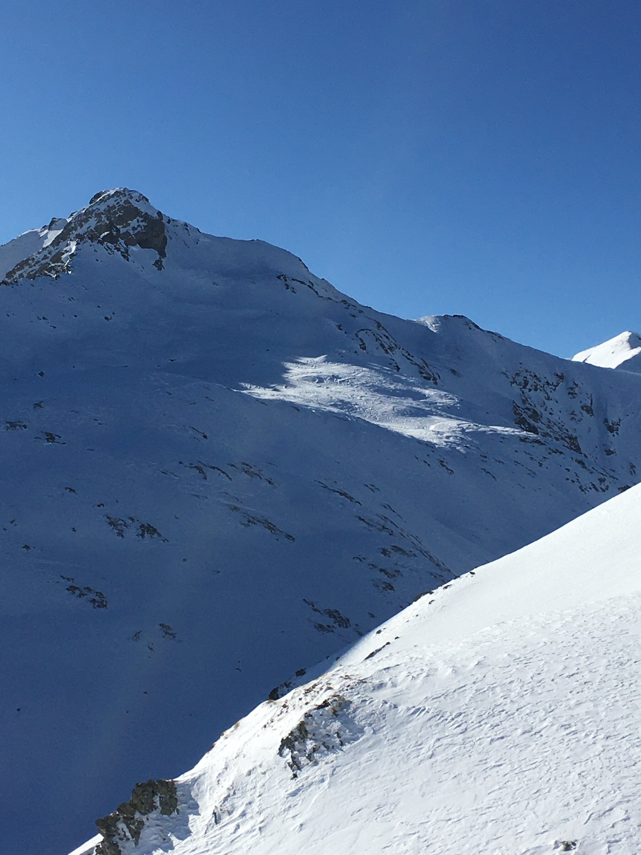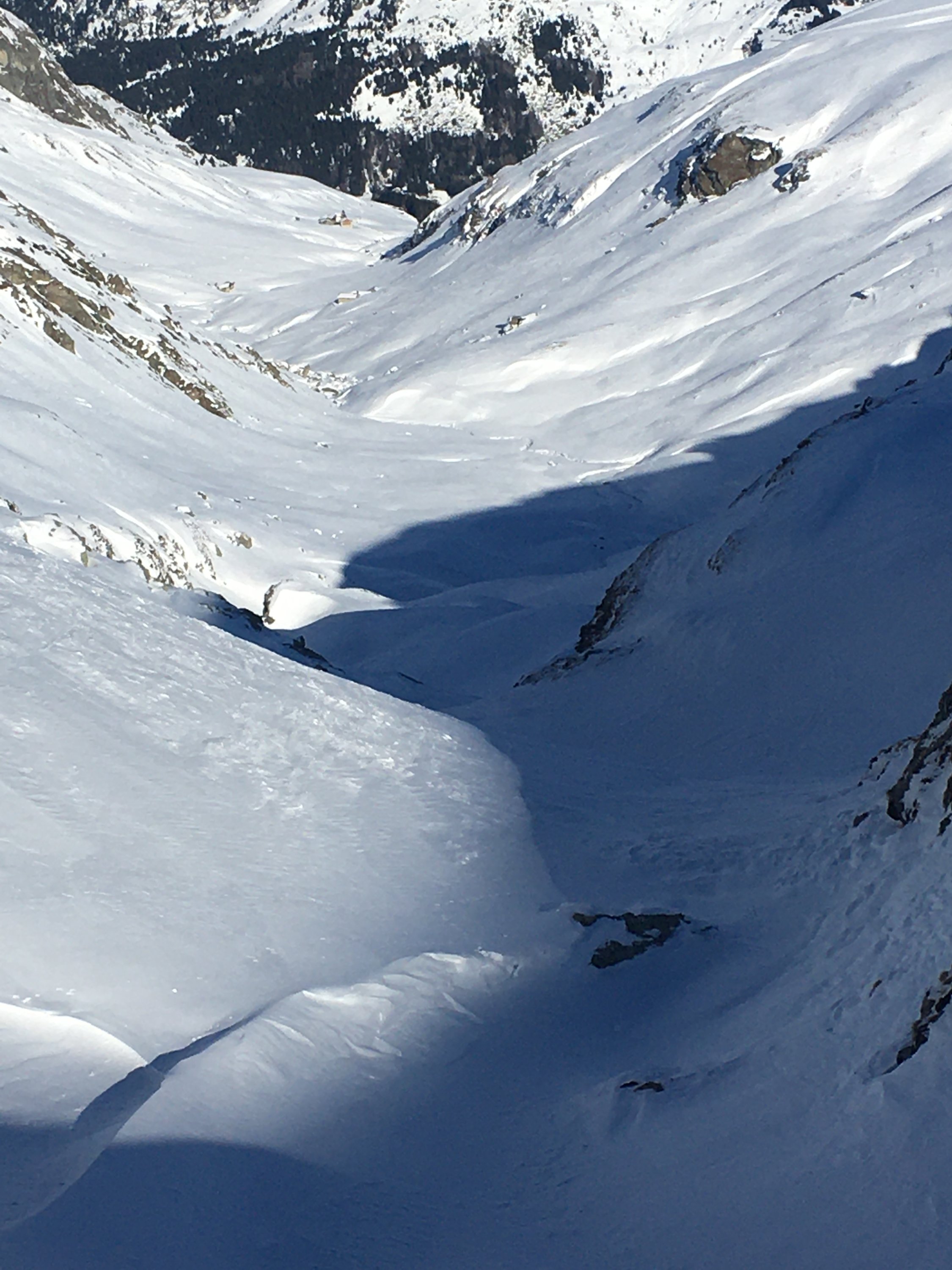 Start 9 Uhr Skilift Bivio (Talstation), minus 5 Grad, windstill. Mit Bügellift bis Mot Scalotta 2562 m. Nun anfellen und nach kurzem Aufstieg etwas abfahren und weiter traversieren in der Flanke Sur al Cant. Oberhalb Leg Curegia steiler hinauf Richtung Osthang Columban. Nun am besten nach rechts ausholen und dann westwärts unterhalb Gipfelgrat und dann sanft zum Gipfel. Ich bin links rum den steilen Osthang unterhalb einem grossen Schneebrett und dann den Südostgrat hinauf, nicht optimal. Abfahrt den steilen Nordhang runter zum Leg Columban. Die ersten 100 Höhenmeter Bruchharst, weiter unten immer besser und vielfach schöner Pulver mit guter Unterlage. Im interessanten Valletta da Beiva vielfach Pulver, auch einige Passagen mit Hartschnee, aber meist schön zu fahren. Man sollte meistens auf der rechten Seite des Tales bleiben, einige unübersichtliche enge und steile Passagen. Im Nordhang Schatten, weiter unten teilweise Sonne. Am Schluss über Skipiste direkt zum guten Kaffee Roccabella mit hausgemachten Kuchen.