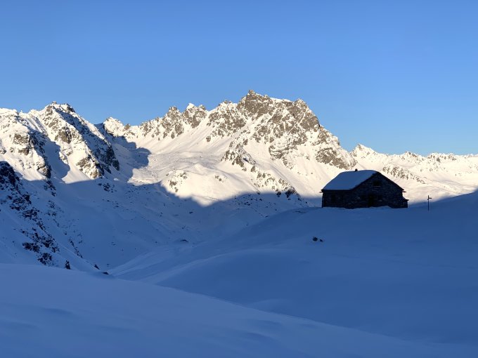 Generell eher wenig Schnee, im Aufstieg überwiegend hart; schöner Pulver dagegen bei der Abfahrt vom Gipfel nach Osten in‘s Vergaldatal. Vorsicht wg. vorstehender Felsen geboten. Die Autobahn vom Hinterberg gut fahrbar. Insgesamt wunderschöne Tour bei den aktuellen Verhältnissen.