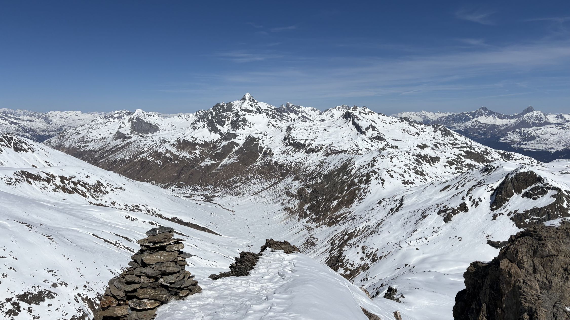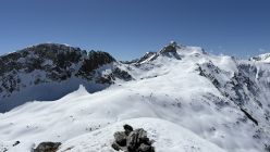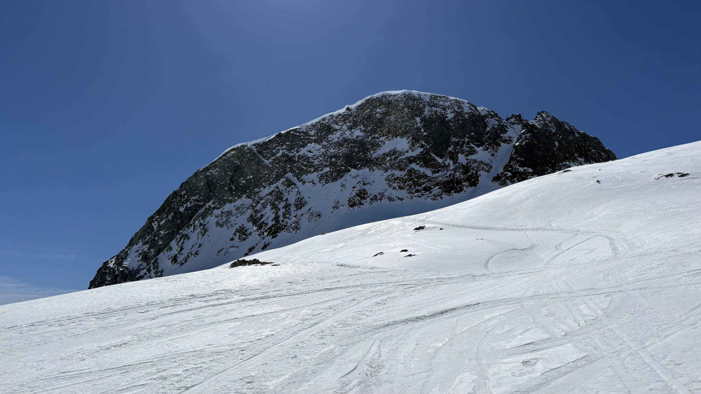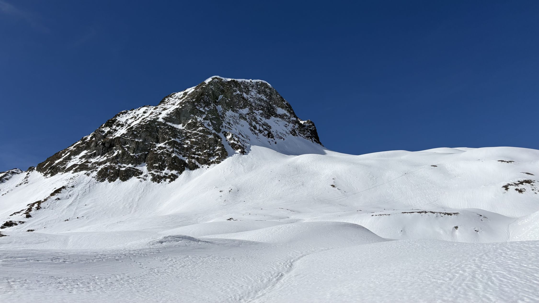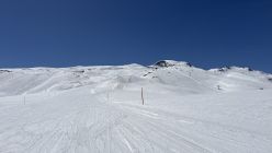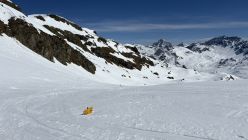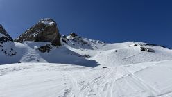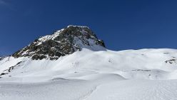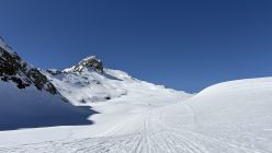 Ab ca. 2700 wechselte der Sulz auf Presspulver. Eine recht gute Spur erlaubte ohne Harscheisen bis zum Skidepot zu steigen. Die restlichen Meter zum windstillen Gipfel wiesen tiefe Trittspuren auf.