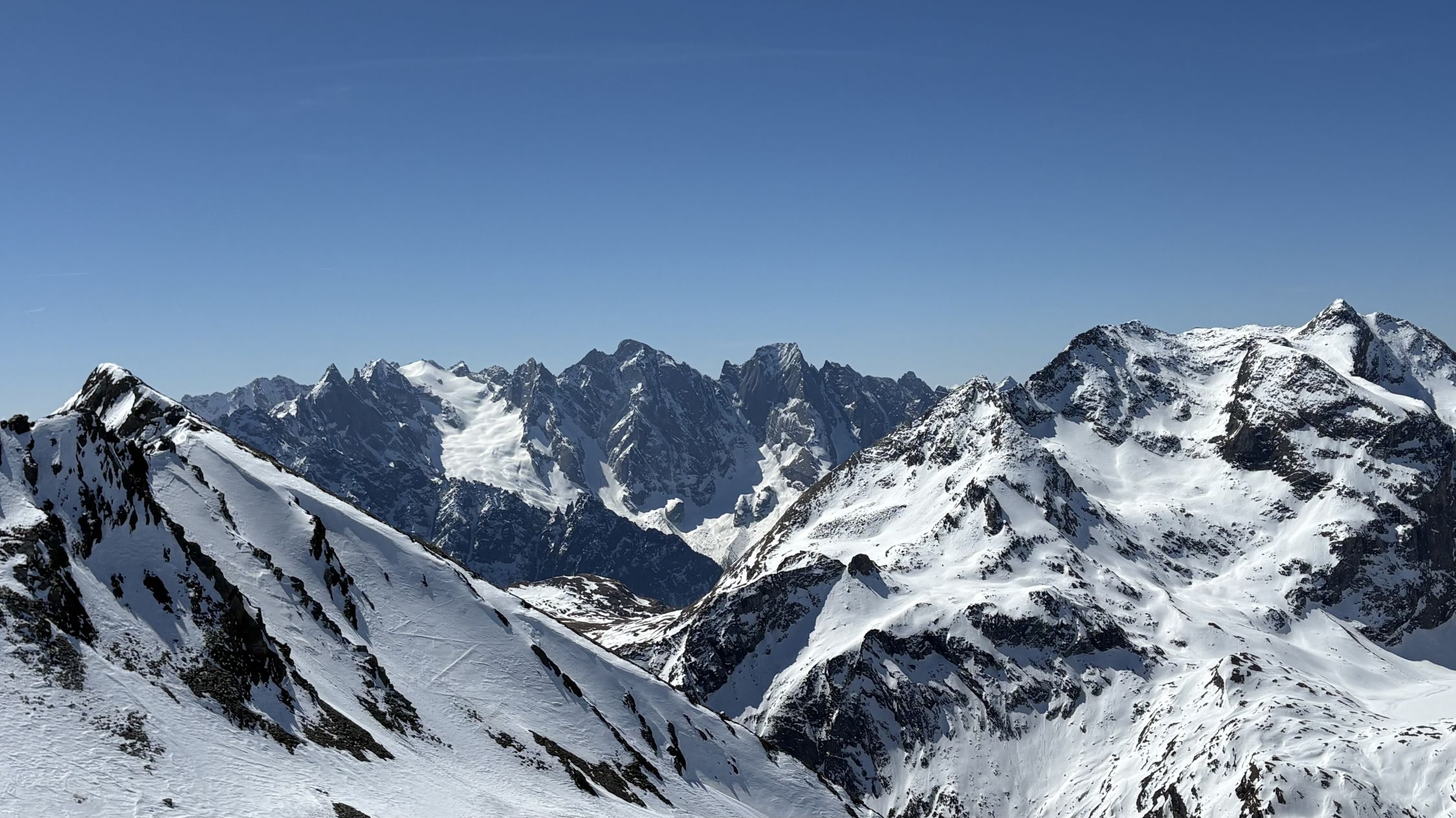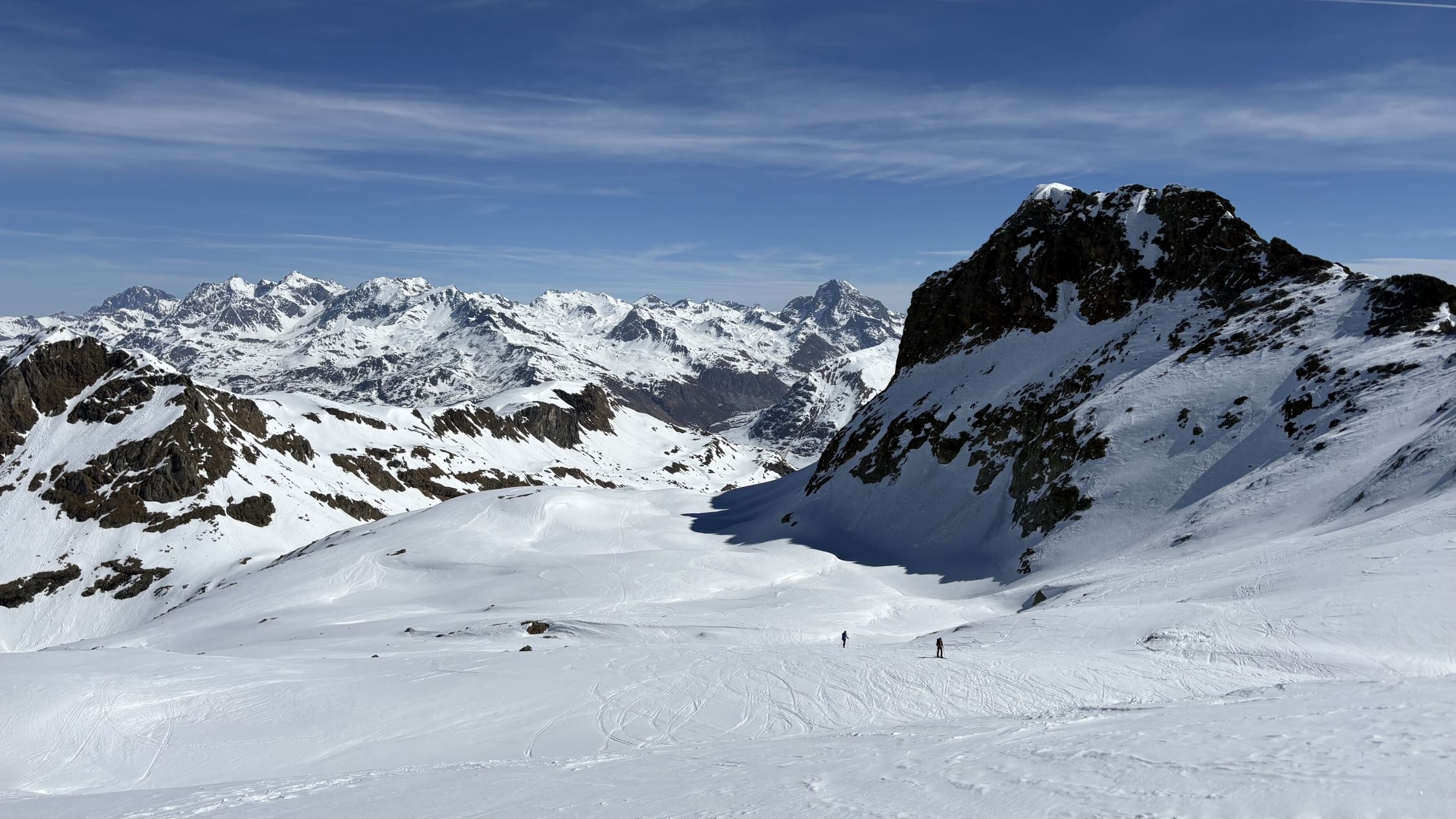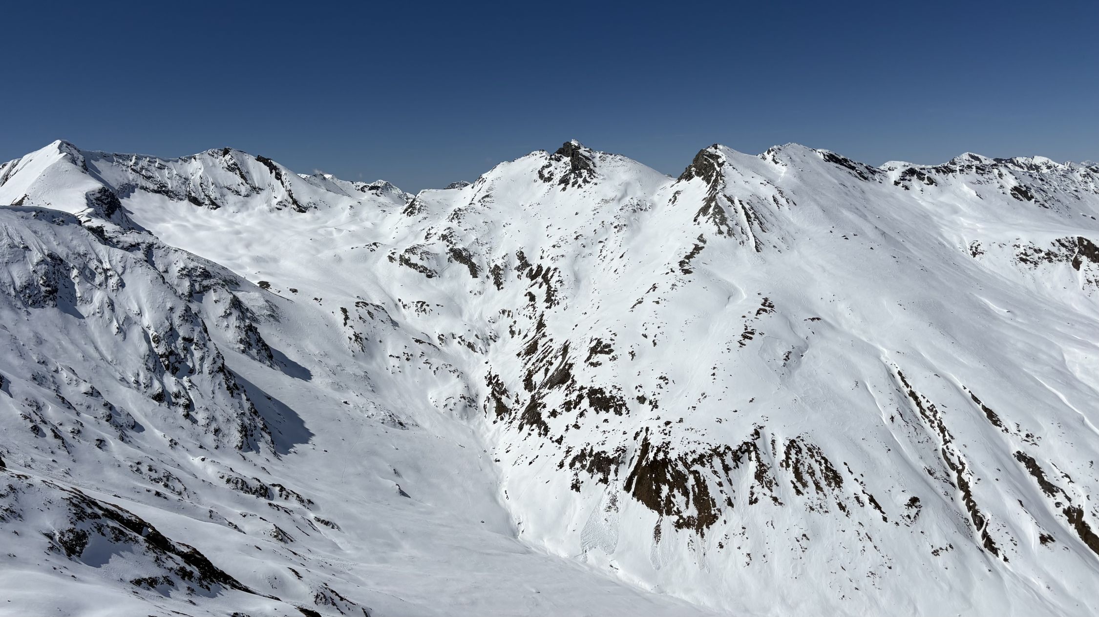 Ab ca. 2700 wechselte der Sulz auf Presspulver. Eine recht gute Spur erlaubte ohne Harscheisen bis zum Skidepot zu steigen. Die restlichen Meter zum windstillen Gipfel wiesen tiefe Trittspuren auf.