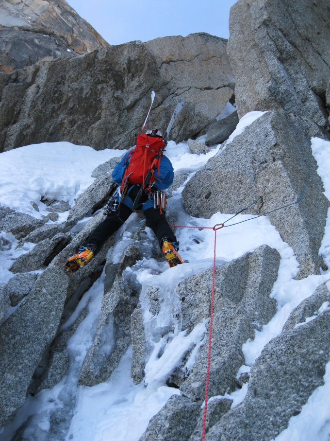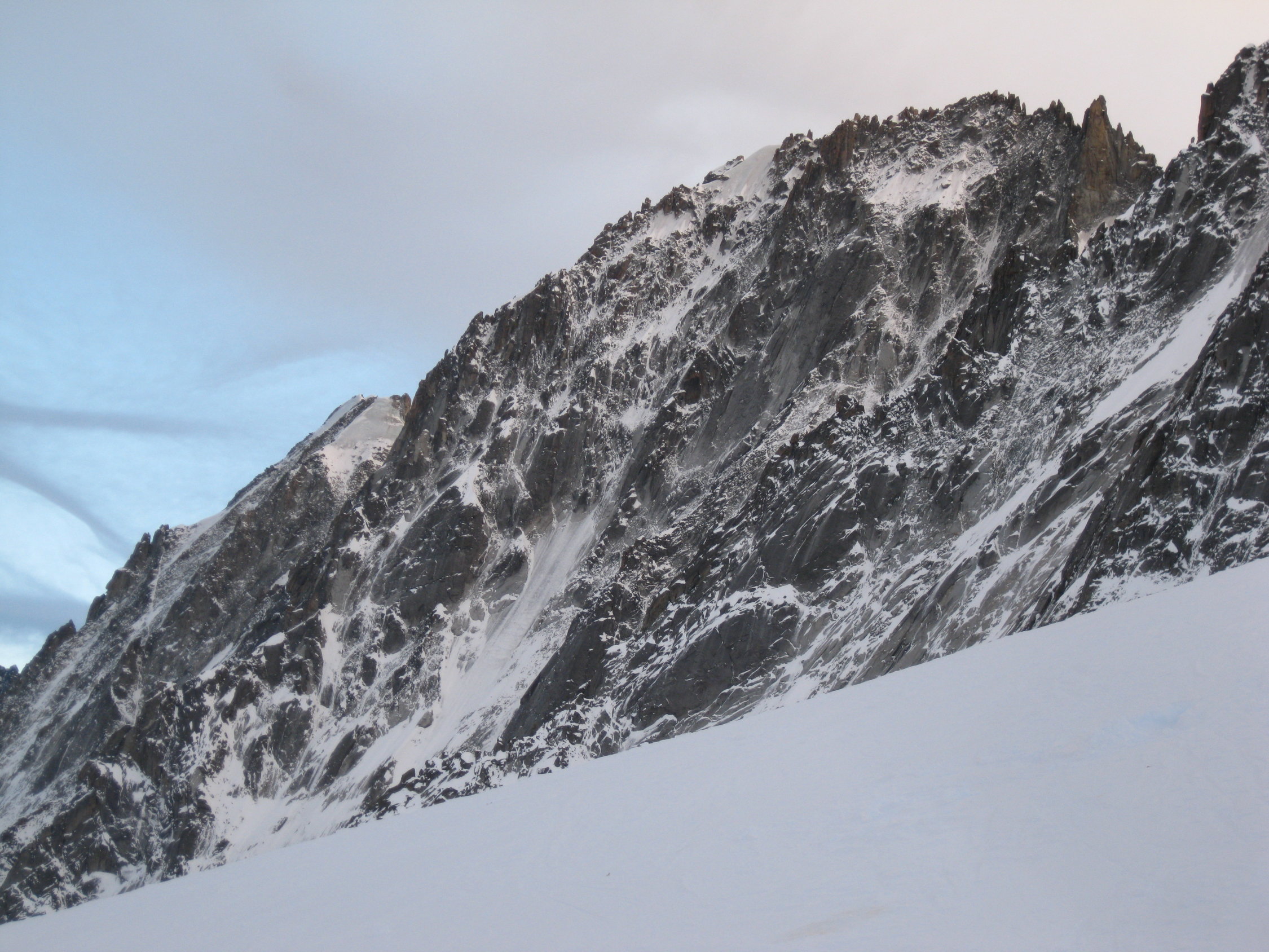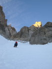 Bergschrund ging gut. Harter Schnee, 70-75°, seilfrei, kurz.
