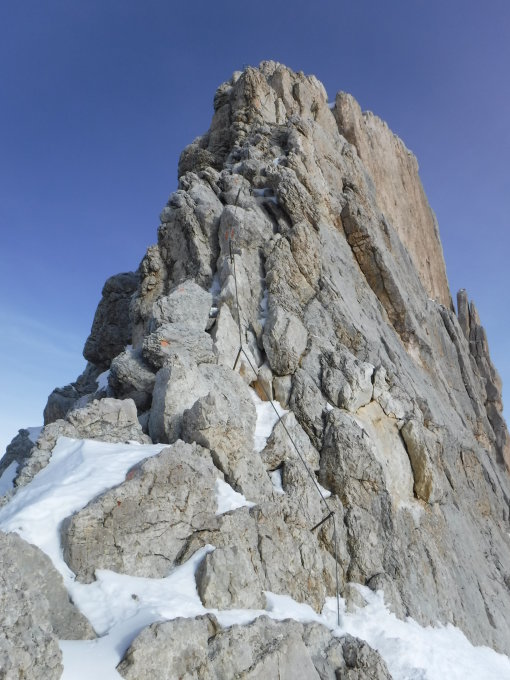 Tourenbeginn bei der Faneshütte um 08:10 Uhr bei 2°C unter heiterem Himmel. Mittags kam Hochnebel auf. Unten und oben Bruchharst. Schneeansammlungen waren noch pulvrig. Jedoch gute Aufstiegsspur vorhanden. Trittspur über den Klettersteig war an der Nordwestseite vereist, das Seil reifglatt. Oberer und unterer Seilabschnitt war schneefrei. Nur der Mittelteil im horizontalen Bereich war eingeschneit. Die Passage ging ohne Steigeisen.