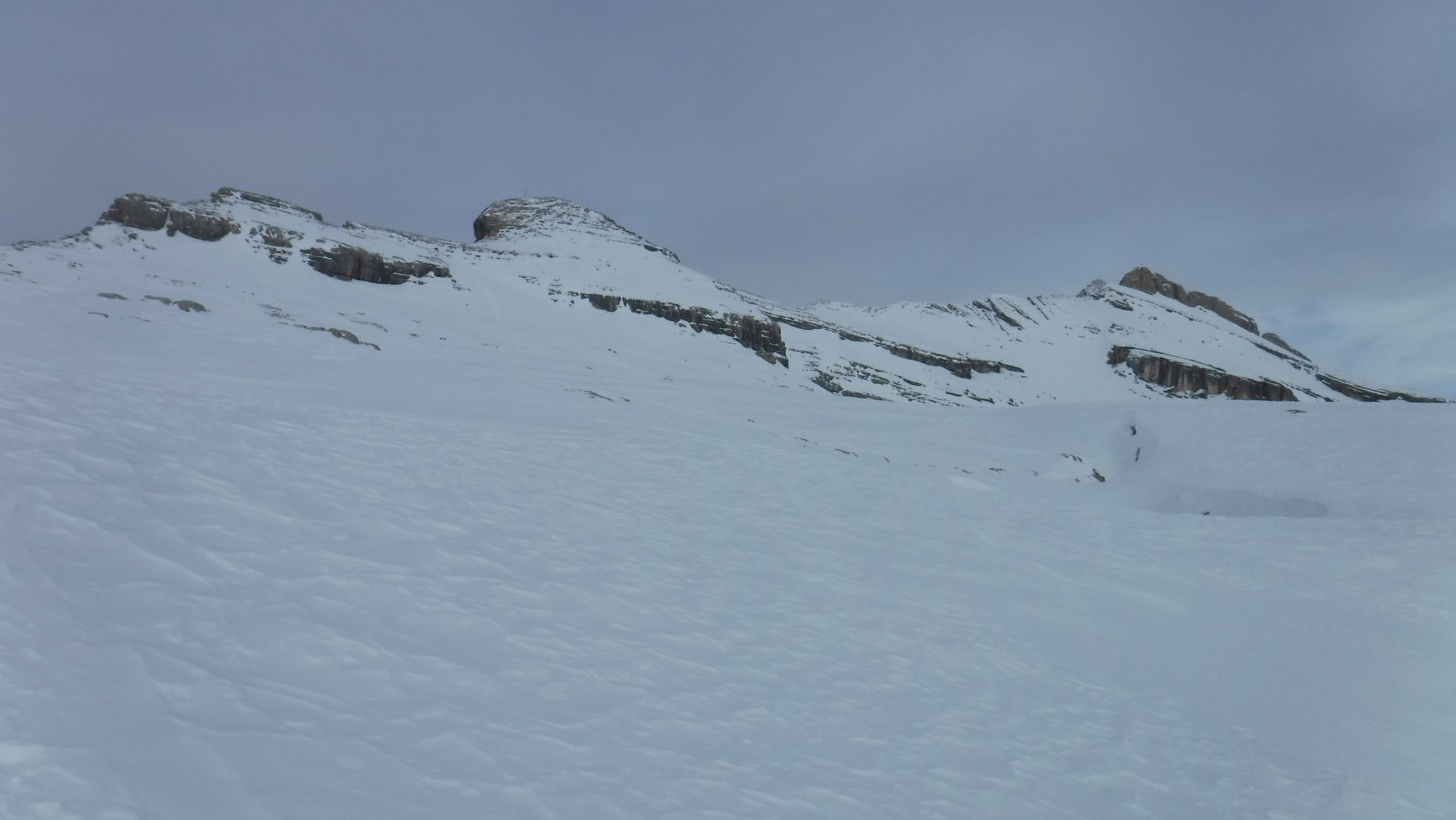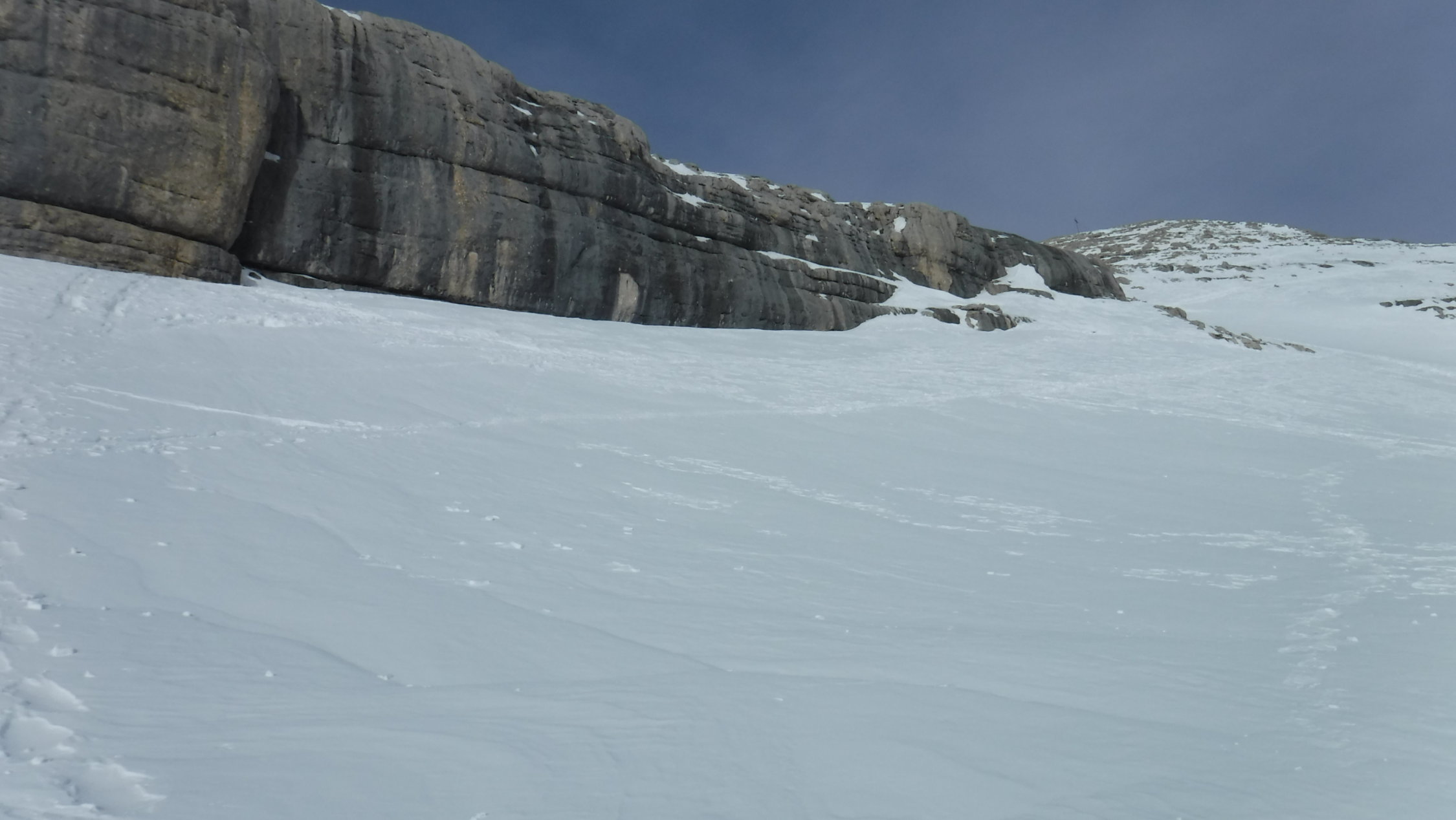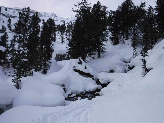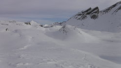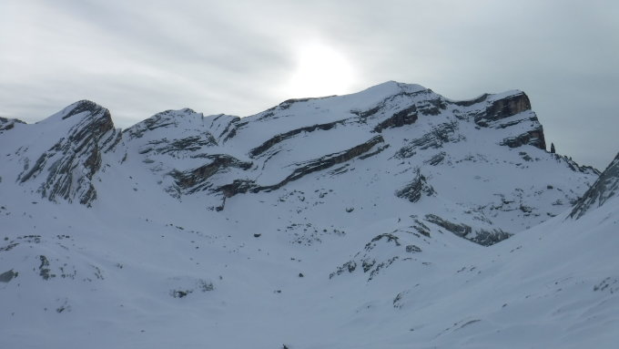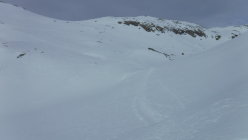 Ich war auf der Route zwar der erste heute unterwegs, konnte mich jedoch gut nach ausgetretener Spur aus den Vortagen der SS-Gruppen richten, die durch den Wind lediglich stellenweise abgeblasen, oder zuverfrachtet wurde. Im Abstieg begegnete ich einem Skitourengänger und einem SS-Pärchen.