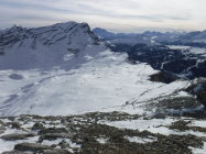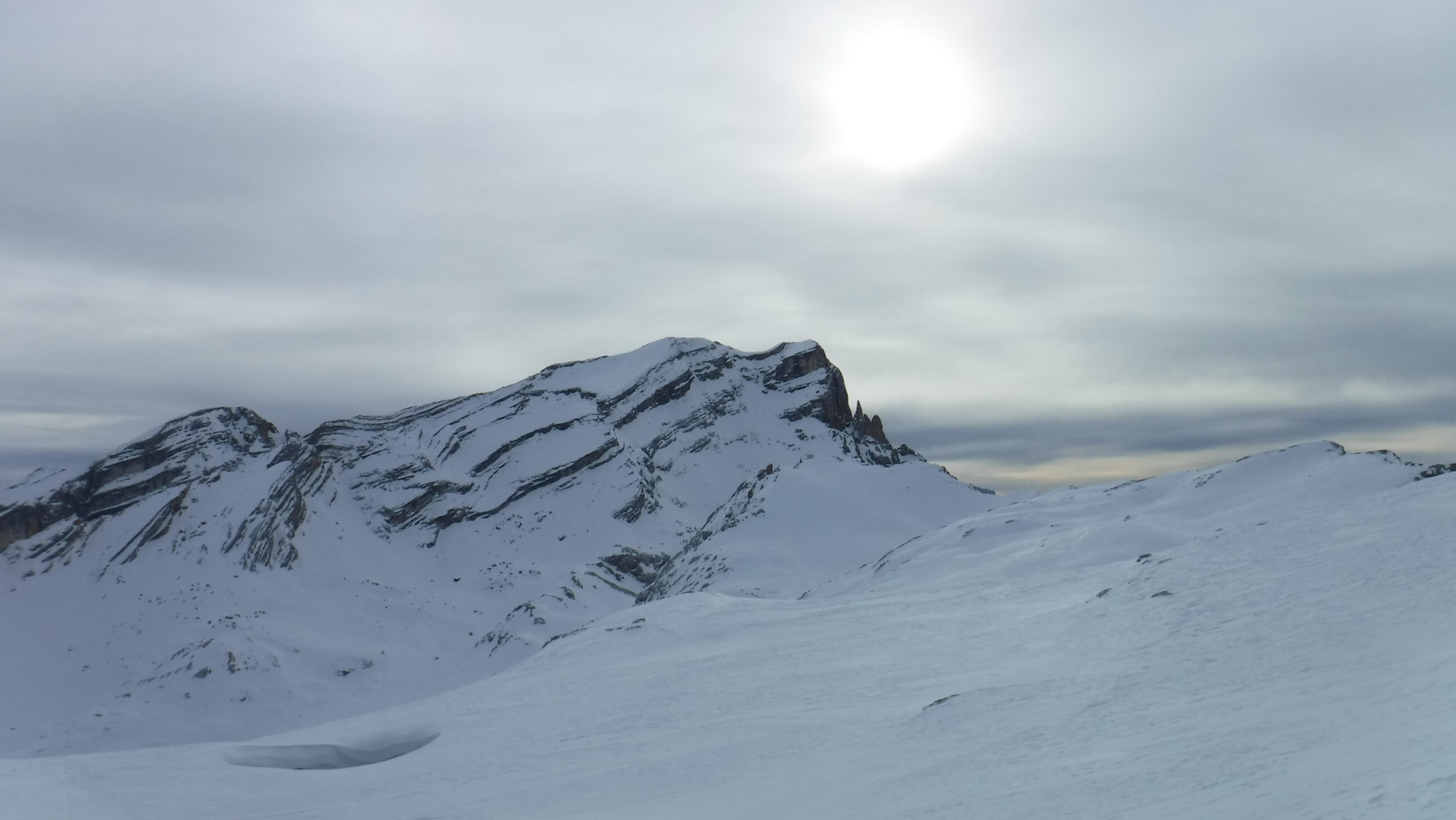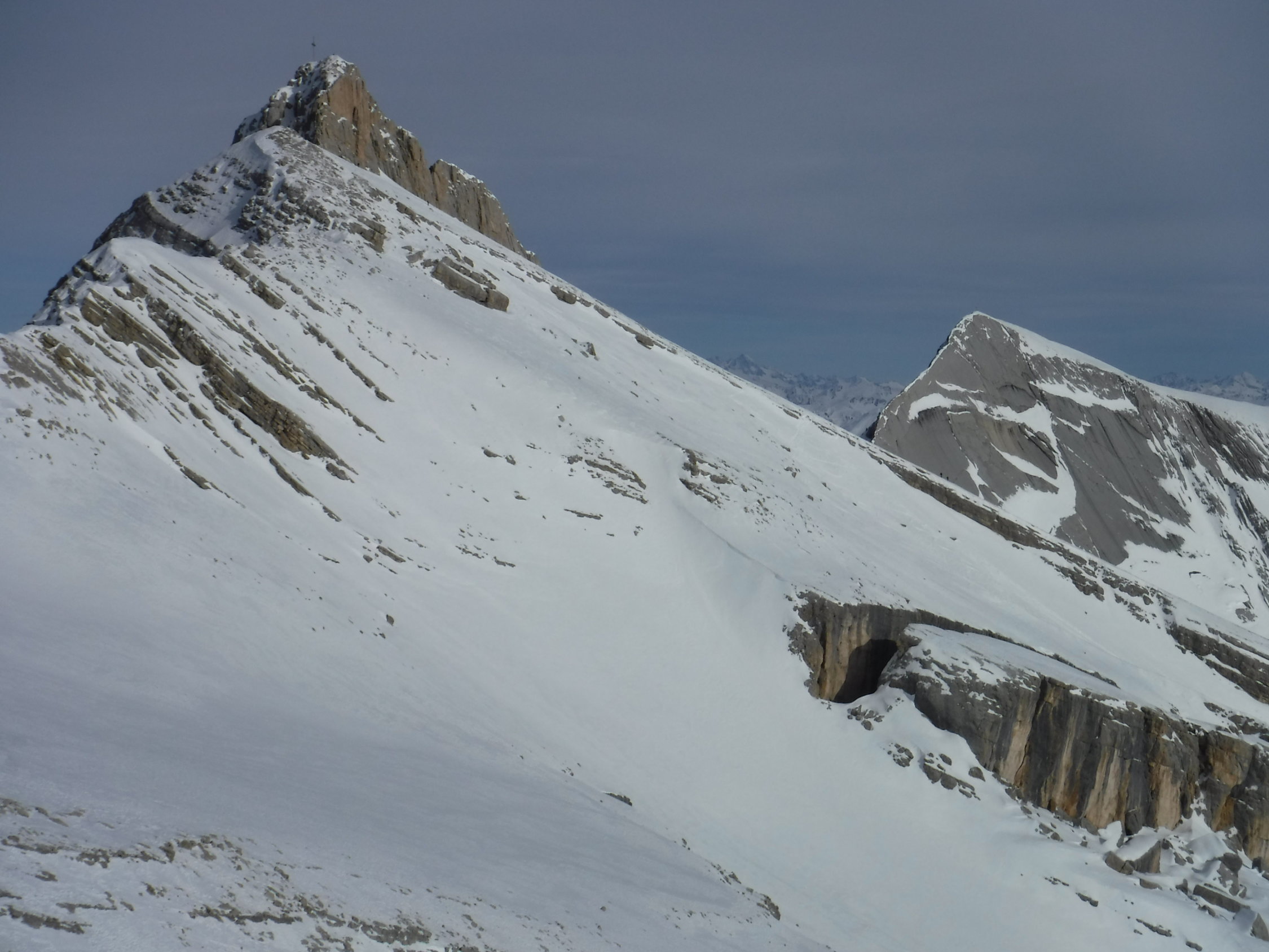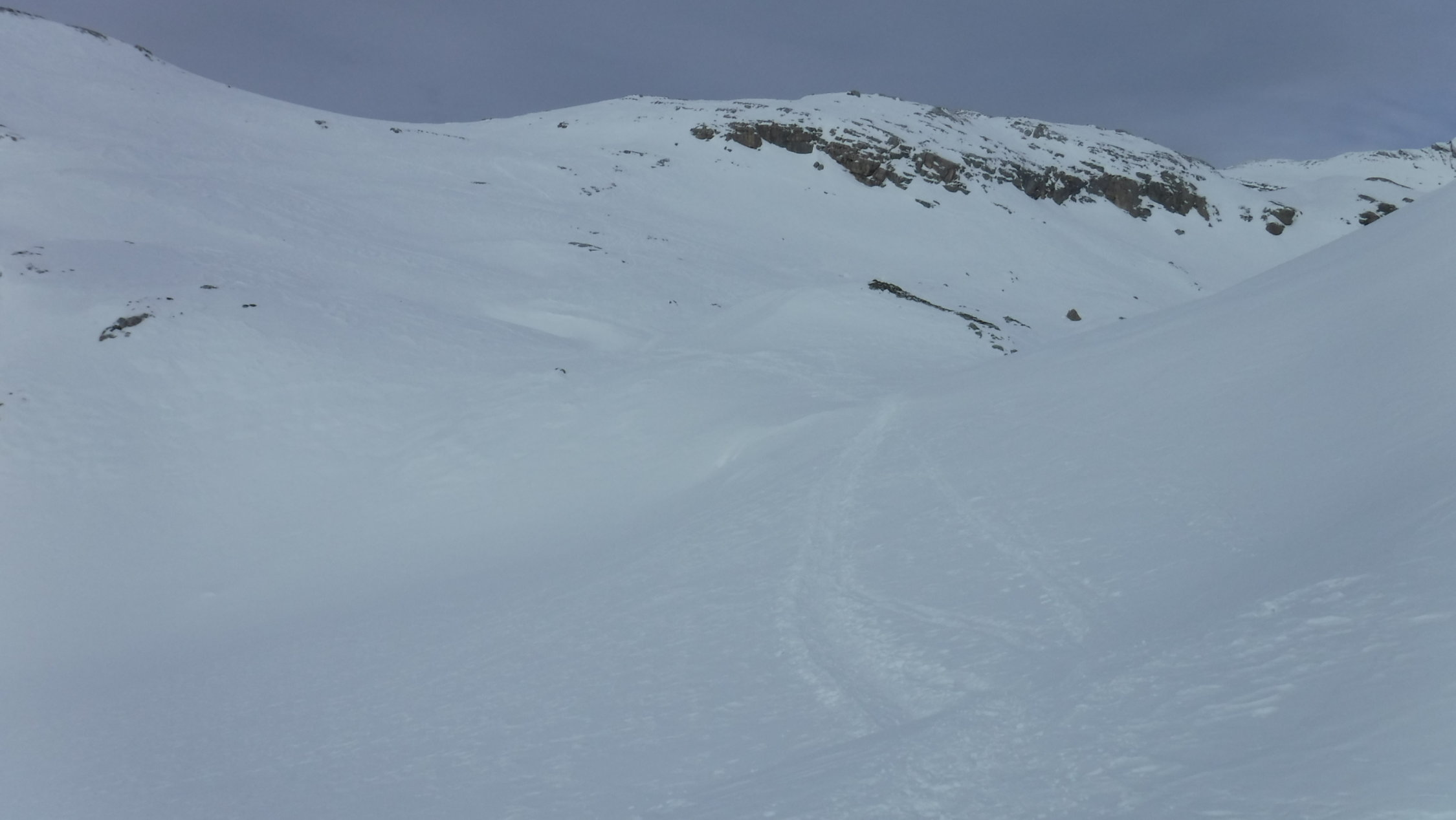 Ich war auf der Route zwar der erste heute unterwegs, konnte mich jedoch gut nach ausgetretener Spur aus den Vortagen der SS-Gruppen richten, die durch den Wind lediglich stellenweise abgeblasen, oder zuverfrachtet wurde. Im Abstieg begegnete ich einem Skitourengänger und einem SS-Pärchen.