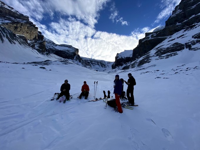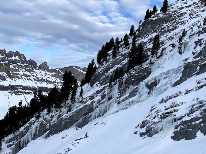 Achtung: Im obersten Teil des Steilhangs ist die Routenwahl zur Zeit schwierig, weil es wenig Schnee hat. Wir hatten zwar Harscheisen montiert, aber Steigeisen wären heute praktischer gewesen für die letzten Meter.